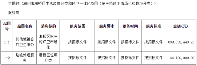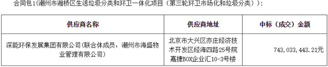 近日,中國固廢網(wǎng)從E20環(huán)境平臺標訊采集系統(tǒng)E標通獲悉,廣東省潮州市湘橋區(qū)生活垃圾分類和環(huán)衛(wèi)一體化項目(第三輪環(huán)衛(wèi)市場化和垃圾分類)、潮州市楓溪區(qū)生活垃圾分類和環(huán)衛(wèi)一體化項目(第三輪環(huán)衛(wèi)市場化和垃圾分類)相繼發(fā)布中標公告,深能環(huán)保聯(lián)合體中標湘橋區(qū)項目,中標金額約7.43億元,服務(wù)期限5年;除此之外,深能環(huán)保又單獨斬獲楓溪區(qū)項目,中標金額約2.51億元,服務(wù)期限5年。