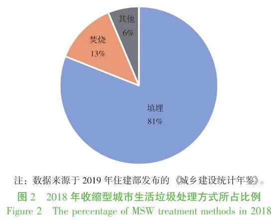 2)垃圾清運(yùn)量有增有減。我國大多數(shù)收縮型城市的經(jīng)濟(jì)仍在發(fā)展,這是與發(fā)達(dá)國家收縮型城市的一個顯著區(qū)別,但隨著人口數(shù)量的降低,垃圾清運(yùn)總量在不同程度地減少。然而,也有不少城市(例如大石橋、大慶、漢川等)的垃圾清運(yùn)量還在持續(xù)增加,這主要因?yàn)檫@些城市垃圾清運(yùn)服務(wù)的覆蓋范圍不斷擴(kuò)大,一些郊區(qū)、鄉(xiāng)鎮(zhèn)垃圾也納入到統(tǒng)一的清運(yùn)體系中。 3)人均垃圾清運(yùn)量較低。收縮型城市的垃圾清運(yùn)量基本代表了清運(yùn)服務(wù)覆蓋區(qū)域的垃圾產(chǎn)生量(僅少量可回收物未進(jìn)入清運(yùn)系統(tǒng))。收縮型城市的人均垃圾清運(yùn)量為(1.23±0.35)kg/d。值得注意的是,許多城市的垃圾清運(yùn)服務(wù)范圍不僅覆蓋城區(qū)人口,也覆蓋了郊區(qū)和部分鄉(xiāng)村地區(qū),因此人均清運(yùn)量數(shù)值偏高(城區(qū)人口少于垃圾清運(yùn)服務(wù)人口)。一些地級市的垃圾清運(yùn)量和城區(qū)人口有較好的對應(yīng)關(guān)系,其人均垃圾清運(yùn)量多在0.8~1.1 kg/d,低于發(fā)達(dá)城市。 4)垃圾處理以填埋為主。這49座城市清運(yùn)的生活垃圾基本實(shí)現(xiàn)了無害化處理,但處理以衛(wèi)生填埋方式為主,共有填埋場42座,而焚燒廠僅7座(主要在四川、江蘇),其他設(shè)施4座。從處理量上看,填埋方式也占約81%(圖2),比例顯著高于全國平均水平(40%),難以滿足可持續(xù)發(fā)展的要求。