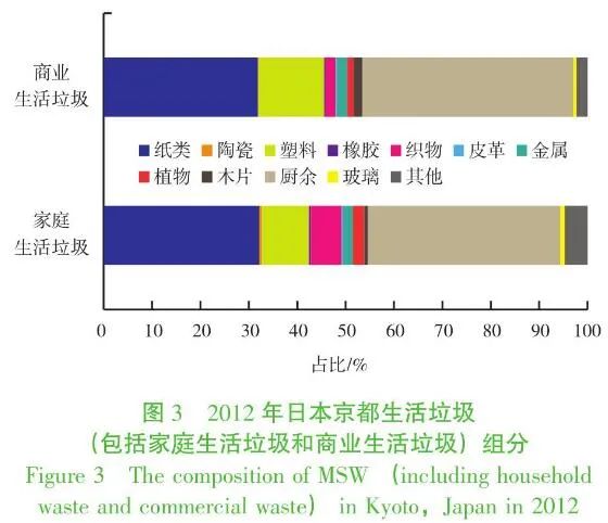 在垃圾組分上,通常經(jīng)濟(jì)越發(fā)達(dá),廚余垃圾在全部生活垃圾中的占比就越低,而可回收物占比就越高。例如,日本京都廚余垃圾占家庭垃圾的40%左右(圖3),而美國廚余垃圾占垃圾總量的21.6%,都明顯低于中國廚余垃圾的占比。這意味著,在中國的收縮型城市,隨著經(jīng)濟(jì)的發(fā)展、人口的逐漸減少和廚余垃圾占比的降低,總的廚余垃圾產(chǎn)生量也會有所下降。參考上海、深圳等城市的生活垃圾組分,到2030年,收縮型城市廚余垃圾在全部生活垃圾中的占比可以按40%~50%估計。