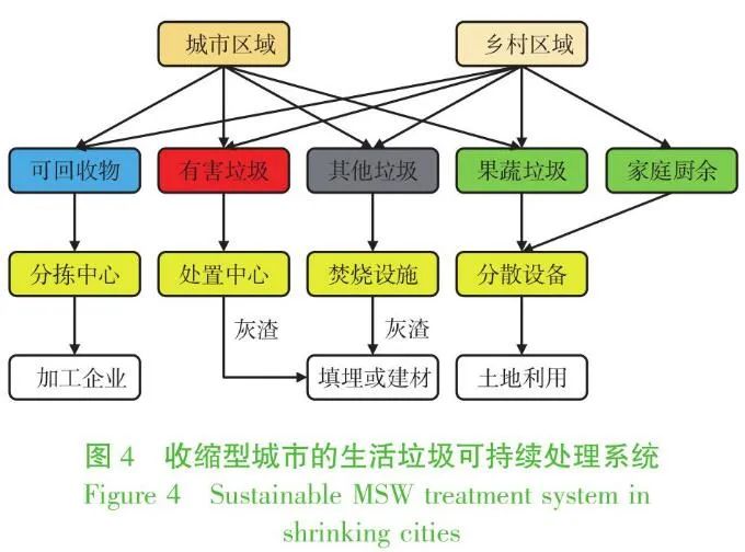 針對這一趨勢,收縮型城市生活垃圾管理應(yīng)采用更為靈活的策略,在鄉(xiāng)村地區(qū)重點(diǎn)開展廚余垃圾的就地利用,在城市地區(qū)生活垃圾分為可回收物、有害垃圾和其他垃圾,而將果蔬垃圾作為重點(diǎn)廚余垃圾管理,同時加強(qiáng)源頭減量和適度分散處理,構(gòu)建以焚燒為核心的彈性處理系統(tǒng)。