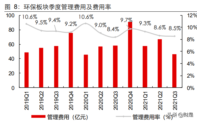 費用端得到控制:2021Q1-Q3環(huán)保板塊期間費用累計支出為361.8億元,同比增14.6%, 期間費用率同比降1.2pct至15.7%。費用率方面,銷售費用率 2.8%,同比降0.41pct;管理費用(含研發(fā)費用,下同)率8.8%,同比降 0.37pct;財務費用率4.1%,同比降0.41pct。期間費用率同比下行的主要原因是:疫情后,收入同比大幅增長23.3%,致期間費用率顯著下行。2021Q1-Q3期間費用增速分別為:檢測同比增31.3%,期間費用率同比降 1.1pct至33.6%;水務運營同比增20.4%,期間費用率同比降1.1pct至14.7%;監(jiān)測同比增17.8%,期間費用率同比增4.8pct至42.5%;固廢同比增15.0%,期間費用率同比降0.55pct至11.8%;大氣同比增10.3%,期間費用率同比降 0.88pct至14.4%;水(工程設備)同比增9.6%,期間費用率同比降 4.0pct 至 20.5%;節(jié)能同比增2.4%,期間費用率同比降2.2pct 至 13.8%。