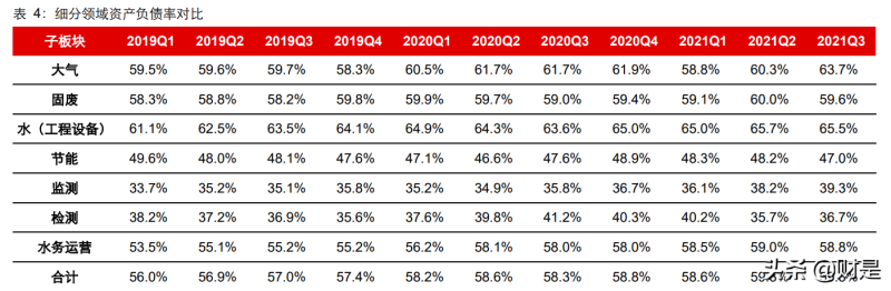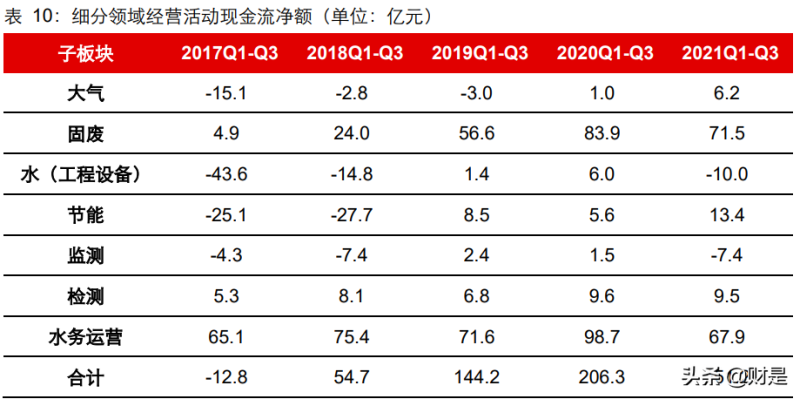 現(xiàn)金流量表:收入快速增長致收現(xiàn)比下行,投融資數(shù)據(jù)環(huán)比回暖2021Q1-Q3 環(huán)保板塊銷售商品收到現(xiàn)金/營收比率(收現(xiàn)比)為 87.7%,同比降 7.2pct,處于歷史數(shù)據(jù)區(qū)間內(nèi);經(jīng)營活動、投資活動及籌資活動產(chǎn)生的現(xiàn)金流量凈額分別 151 億 元(去年同期為 206 億元,同比降 27%)、-526 億元(去年同期為-680億元,凈支出同 比減少 23%)和 197 億元(去年同期為 540 億元,同比降 64%)。收入快速上行致收現(xiàn)比下降,并非回款惡化。環(huán)保行業(yè)收入存在收款周期,而收入的快速上行致當期收現(xiàn)比下降,并非行業(yè)回款惡化。行業(yè)經(jīng)歷過2018年 PPP 現(xiàn)金流風險后,各公司重視回款,推動 PPP 項目轉(zhuǎn)EPC模式,工程、設備銷售等業(yè)務控制客戶質(zhì)量,并強化前期應收賬款回款等,使得行業(yè)現(xiàn)金流好轉(zhuǎn),結合前文對應收賬款的討論,也可證明回款在向好。