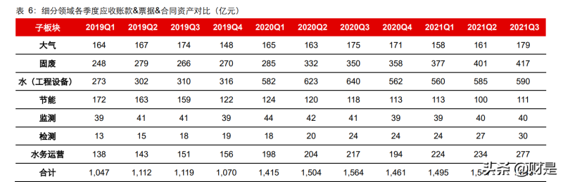 考慮到當下部分公司將實質(zhì)的應收賬款名義上放至存貨科目名下,故我們考慮存貨后, 2021Q3 末應收賬款&票據(jù)+存貨+合同資產(chǎn)同比增 4.9%,(應收賬款&票據(jù)+存貨+合同 資產(chǎn))/營業(yè)收入同比降16.8pct,變動原因:1)水(工程設備)、節(jié)能、大氣的(應收賬款&票據(jù)+存貨+合同資產(chǎn))絕對值有所下降,分別降 6.6%、6.4%、1.6%,強化了回款;2)各子行業(yè) 2021Q1-Q3 均獲得營收正增長,行業(yè)整體同比增 23.3%,特別是檢 測、水(工程設備)的同比增速在 30%以上。