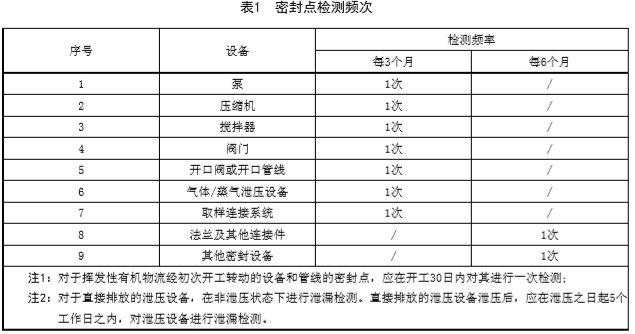 氣體、輕液接觸或流經(jīng)的密封點檢測頻次最低應(yīng)符合企業(yè)所屬行業(yè)標(biāo)準(zhǔn)規(guī)定的檢測頻次,所屬行業(yè)未發(fā)布標(biāo)準(zhǔn),執(zhí)行表1的檢測頻次。