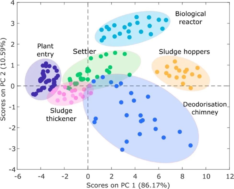 使用無人機的另一個優(yōu)點是便于繪制臭氣地圖。通過PCA主成分分析,污水廠可以更直觀地了解不同地點的臭氣源類型: