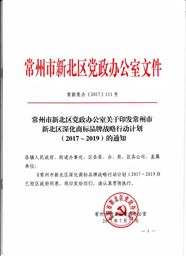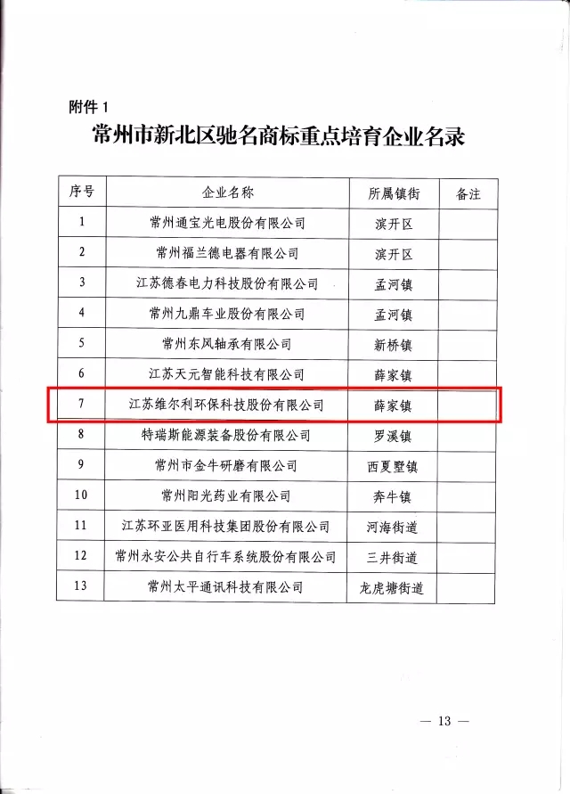 在《常州市新北區(qū)黨政辦公室關(guān)于印發(fā)常州市新北區(qū)深化商標(biāo)品牌戰(zhàn)略行動(dòng)計(jì)劃(2017-2019)的通知》(常新委辦〔2017〕111號)文件中,提出深化商標(biāo)品牌戰(zhàn)略建設(shè),將維爾利環(huán)保作為常州市新北區(qū)馳名商標(biāo)重點(diǎn)培育企業(yè),實(shí)施“產(chǎn)業(yè)品牌提升”工程,打響產(chǎn)業(yè)品牌特色優(yōu)勢,培育細(xì)分行業(yè)新品牌。