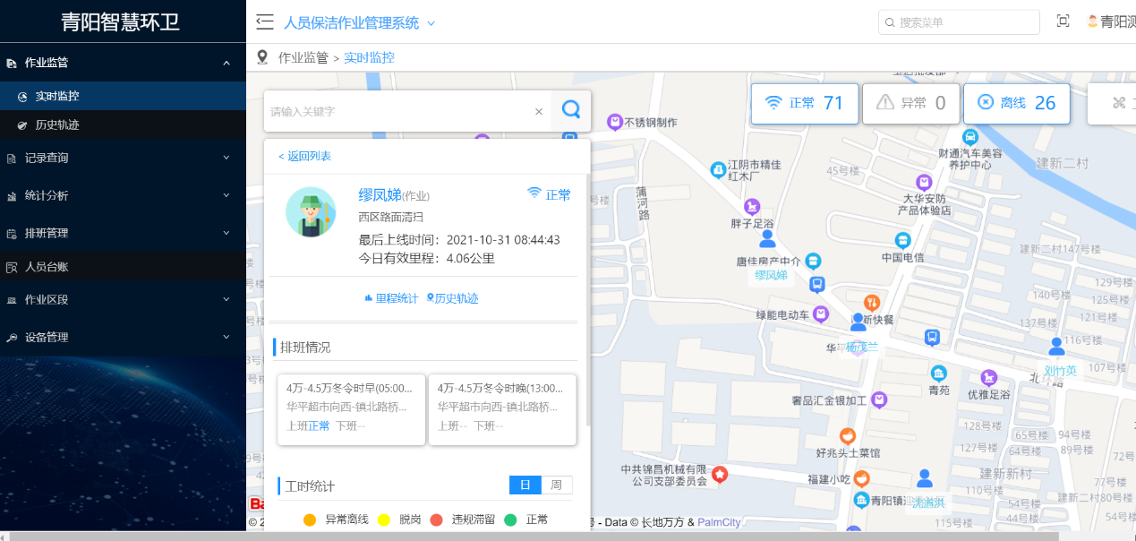 智慧環(huán)境平臺(tái)可將所有環(huán)衛(wèi)相關(guān)人員和設(shè)備納入監(jiān)管之中,并且提供歷史數(shù)據(jù)查詢、人員臺(tái)賬等功能。