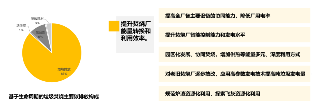 根據(jù)我院測算分析,在不采取填埋處理的情況下,典型區(qū)域范圍內(nèi)生活垃圾處理領(lǐng)域碳排放及減排量較高的對象依次為:焚燒、可回收物、廢棄油脂及濕垃圾。相關(guān)減碳工作可根據(jù)輕重緩急逐步推行。就焚燒廠而言主要是提升能量轉(zhuǎn)換和利用效率。