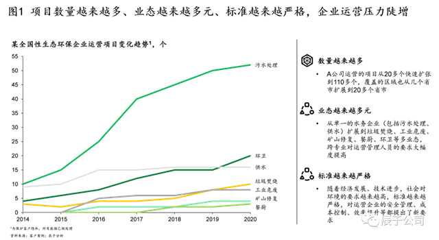 近幾年來(lái),一批環(huán)保企業(yè)蓬勃發(fā)展,規(guī)模迅速擴(kuò)張,他們所持有的項(xiàng)目數(shù)量越來(lái)越多,業(yè)態(tài)越來(lái)越多元。以我們服務(wù)的某全國(guó)性生態(tài)環(huán)保企業(yè)為例,2014-2020年間,運(yùn)營(yíng)項(xiàng)目從20多個(gè)增加到100多個(gè),覆蓋區(qū)域從8個(gè)省市擴(kuò)張到20多個(gè),業(yè)態(tài)也從單一的污水、供水,延伸到垃圾焚燒、工業(yè)危廢、礦山修復(fù)、餐廚、環(huán)衛(wèi)等“水、固、生態(tài)修復(fù)”協(xié)同發(fā)展(見(jiàn)圖1)。