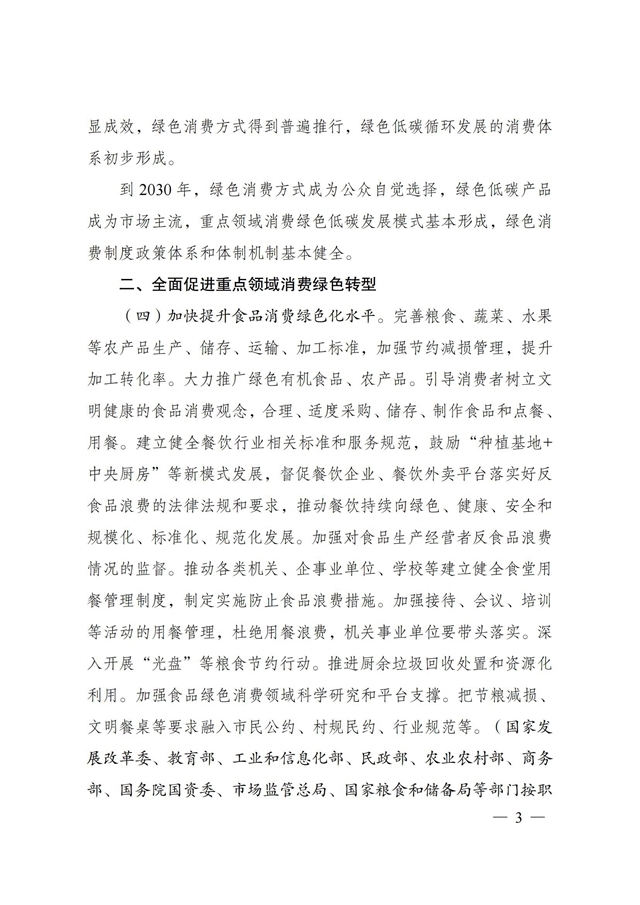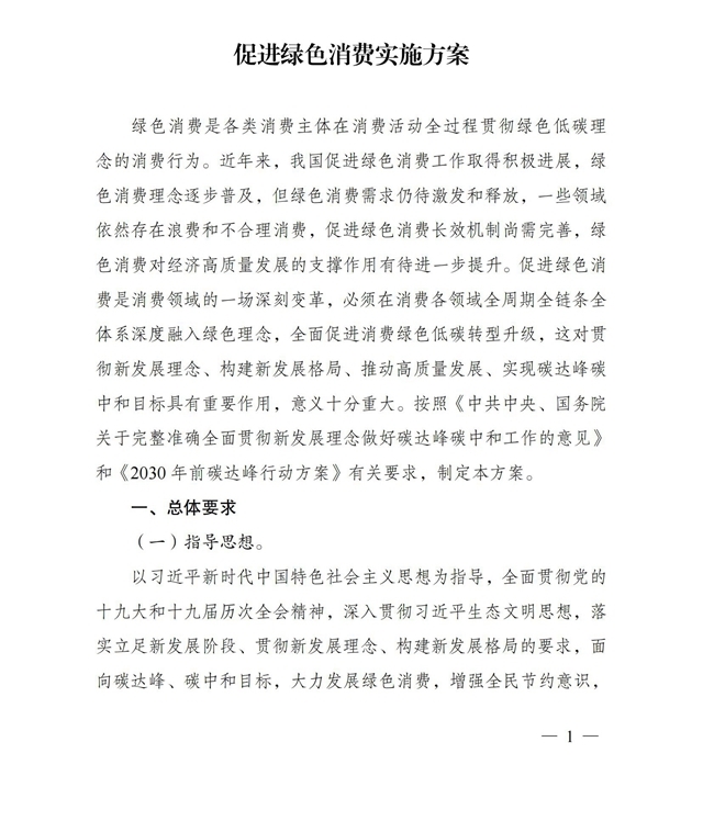 為深入貫徹落實《中共中央、國務(wù)院關(guān)于完整準確全面貫徹新發(fā)展理念做好碳達峰碳中和工作的意見》和《2030年前碳達峰行動方案》有關(guān)要求,根據(jù)碳達峰碳中和工作領(lǐng)導(dǎo)小組部署安排,國家發(fā)展改革委、工業(yè)和信息化部、住房和城鄉(xiāng)建設(shè)部、商務(wù)部、市場監(jiān)管總局、國管局、中直管理局會同有關(guān)部門研究制定了《促進綠色消費實施方案》?,F(xiàn)印發(fā)給你們,請結(jié)合實際,認真抓好貫徹落實。