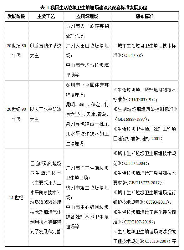 1.1 我國(guó)垃圾填埋場(chǎng)發(fā)展歷程 我國(guó)生活垃圾衛(wèi)生填埋技術(shù)主要經(jīng)歷了三個(gè)階段:20世紀(jì)80年代以垂直防滲為主的衛(wèi)生填埋場(chǎng)、20世紀(jì)90年代以水平防滲為主的衛(wèi)生填埋場(chǎng)、21世紀(jì)垃圾衛(wèi)生填埋技術(shù)、垃圾滲濾液處理技術(shù)及填埋氣體利用技術(shù)完善的衛(wèi)生填埋場(chǎng),建設(shè)及配套標(biāo)準(zhǔn)見表1[1]。