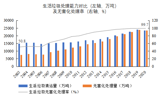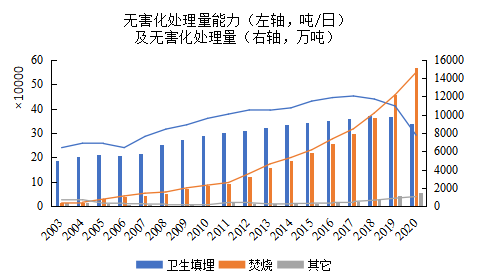 圖 1我國(guó)2003-2020年生活垃圾清運(yùn)量及無害化處理能力(數(shù)據(jù)來源:中國(guó)統(tǒng)計(jì)年鑒)