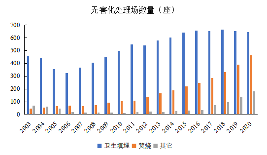 圖2 我國(guó)2003-2020年不同類型的無害化處理場(chǎng)數(shù)量(數(shù)據(jù)來源:中國(guó)統(tǒng)計(jì)年鑒)