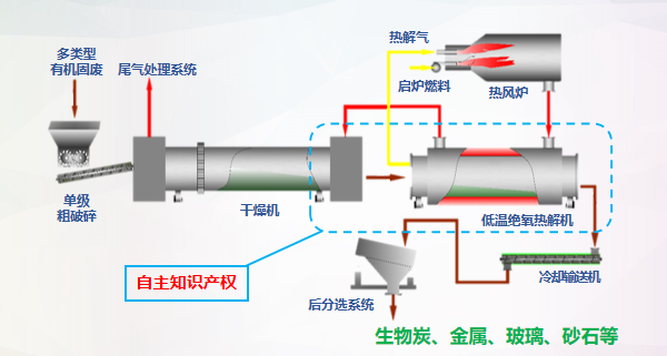低溫絕氧熱解碳化技術(shù)是個負(fù)碳過程,也是碳中和、碳達(dá)峰的重要手段之一。其具有兩大特點:一是,技術(shù)包容性強,污泥、餐廚垃圾等多種類有機固廢協(xié)同處理;二是,100%資源化,熱解氣回歸系統(tǒng)再利用,終產(chǎn)物只有生物炭、金屬、玻璃、砂石。