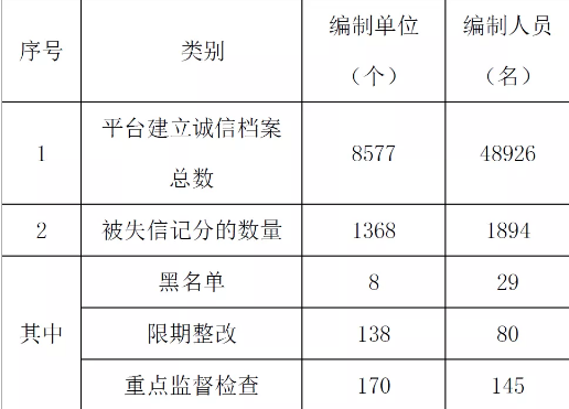 表1 信用平臺建立誠信檔案及失信記分的編制單位及個人數(shù)量表