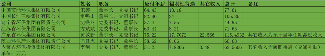 2021年的最后一天,國(guó)務(wù)院國(guó)資委發(fā)布《2020年度中央企業(yè)負(fù)責(zé)人薪酬披露》,公布了96家中央企業(yè)負(fù)責(zé)人的薪酬水平。其中,與環(huán)保行業(yè)有關(guān)的主要是兩家企業(yè),一家是中國(guó)節(jié)能環(huán)保集團(tuán)有限公司(下稱“中節(jié)能”),另一家是中國(guó)長(zhǎng)江三峽集團(tuán)有限公司(下稱“三峽集團(tuán)”)。兩家企業(yè),都是國(guó)家實(shí)施“長(zhǎng)江大保護(hù)”戰(zhàn)略的平臺(tái)型公司,作用都非常重要。兩家企業(yè)中,三峽集團(tuán)負(fù)責(zé)人的薪酬水平略高,董事長(zhǎng)、黨組書記雷鳴山的應(yīng)付年薪和福利性待遇(主要指社會(huì)保險(xiǎn)、企業(yè)年金、補(bǔ)充醫(yī)療保險(xiǎn)及住房公積金)總計(jì)達(dá)到106.86萬(wàn)元,而中節(jié)能董事長(zhǎng)、黨委書記宋鑫則為77.61萬(wàn)元。看完“國(guó)家隊(duì)”的,再來看看地方環(huán)保集團(tuán)的。在國(guó)務(wù)院國(guó)資委公布央企負(fù)責(zé)人薪酬水平的同時(shí),各地方國(guó)資委也公布了2020年度省屬企業(yè)負(fù)責(zé)人的薪酬信息,北極星環(huán)保網(wǎng)專門整理了5家地方環(huán)保集團(tuán)企業(yè)負(fù)責(zé)人的薪酬情況。這5家地方環(huán)保集團(tuán)分別是:遼寧省環(huán)保集團(tuán)有限責(zé)任公司、江蘇省環(huán)保集團(tuán)有限公司、廣東省環(huán)保集團(tuán)有限公司、陜西環(huán)保產(chǎn)業(yè)集團(tuán)有限責(zé)任公司和內(nèi)蒙古環(huán)保投資集團(tuán)有限公司。5家企業(yè)中,企業(yè)負(fù)責(zé)人薪酬最高的是廣東省環(huán)保集團(tuán)有限公司,其董事長(zhǎng)、黨委書記黃敦新應(yīng)付年薪為75.22萬(wàn)元,福利性待遇17.7072萬(wàn)元,另外還有22.5660萬(wàn)元的預(yù)計(jì)當(dāng)年任期激勵(lì)收入,合計(jì)一共是115.4932萬(wàn)元。薪酬最低的,是遼寧省環(huán)保集團(tuán)有限責(zé)任公司,黨委書記、董事長(zhǎng)沈鐵冬應(yīng)付年薪37.40萬(wàn)元,福利性待遇7.55萬(wàn)元,總計(jì)44.95萬(wàn)元。其余3家企業(yè),負(fù)責(zé)人薪酬水平都差不太多,基本在60萬(wàn)元-70萬(wàn)元之間。全部看下來,可以看出,無論是“國(guó)家隊(duì)”還是地方環(huán)保集團(tuán),企業(yè)負(fù)責(zé)人的薪酬水平都不能算太高,超過100萬(wàn)元的已屬于鳳毛麟角,大部分都在60萬(wàn)元-70萬(wàn)元左右。相對(duì)來說,南方企業(yè)總體來講比北方企業(yè)的薪酬水平要高一點(diǎn)。例如廣東、江蘇的地方環(huán)保集團(tuán),企業(yè)負(fù)責(zé)人薪酬就要比陜西、內(nèi)蒙古高,而遼寧在已公布的幾個(gè)省份中則是最低。▼2家環(huán)保央企和5家地方環(huán)保集團(tuán)企業(yè)負(fù)責(zé)人薪酬信息。制圖:環(huán)保圈看完環(huán)保行業(yè)央企和地方國(guó)資的高管薪酬情況,再來看看民企的。這方面,主要信息來源是各大環(huán)保上市公司的2020年的年報(bào)。具體的數(shù)據(jù),《環(huán)保圈》去年曾經(jīng)總結(jié)過,這里直接說結(jié)論。首先,我們統(tǒng)計(jì)了217位上市環(huán)保企業(yè)高管的薪酬水平,平均值是每人97萬(wàn)元/年,接近“百萬(wàn)元”吧。其次,雖然平均值達(dá)到了“百萬(wàn)元”,但具體來看,每個(gè)人的情況差別還是很大的。最高的可以拿到625萬(wàn)元,最低的則只有2.4萬(wàn)元,足足相差了260倍。年薪最高的,是盈峰環(huán)境副總裁陳培亮,2020年年薪高達(dá)625萬(wàn)元,可謂是環(huán)保領(lǐng)域的“最強(qiáng)打工人”。排名第二、第三的也是民企,他們分別是格林美的兩位高管——55歲的董事長(zhǎng)許開華(587萬(wàn)元/年)和62歲的常務(wù)副總王敏(312萬(wàn)元/年)。此外,年薪在150萬(wàn)元以上的還有:中持股份副總經(jīng)理張翼飛、東江環(huán)保董事長(zhǎng)譚侃、節(jié)能國(guó)禎創(chuàng)始人李煒、東方園林董事長(zhǎng)劉偉杰、博天環(huán)境董事長(zhǎng)趙笠鈞、瀚藍(lán)環(huán)境總經(jīng)理金鐸、清新環(huán)境總裁李其林、維爾利董事長(zhǎng)李月中等。可以看出,這些企業(yè)絕大多數(shù)都是民企(2020年時(shí)中持、國(guó)禎、博天等尚未完成“混改”)。▼年薪過200萬(wàn)的13位上市環(huán)保企業(yè)高管第三,再看看排名最低的,則來自于一家國(guó)企。2020年年薪最低的董事長(zhǎng)是富春環(huán)保董事長(zhǎng)萬(wàn)嬌,只有2.5萬(wàn)元,月平均工資約2000元。大家知道,富春環(huán)保是一家剛剛經(jīng)歷了“混改”的企業(yè),2020年南昌市國(guó)資委剛剛?cè)胫?,萬(wàn)嬌則是由南昌國(guó)資提名,代替原董事長(zhǎng)的人選。當(dāng)然,民企高管的薪酬水平也并不一定都很高,也有偏少的。比如中國(guó)天楹,除總裁曹徳標(biāo)年薪36萬(wàn)元外,其余副總裁一律年薪25萬(wàn)元,月工資2.1萬(wàn)。▼中國(guó)天楹高管團(tuán)隊(duì)收入(數(shù)據(jù)/東方財(cái)富網(wǎng))總體來看,排名靠前、薪酬較高的企業(yè),絕大多數(shù)都是業(yè)績(jī)表現(xiàn)好,坐落于北上廣深的大型環(huán)保上市企業(yè),如盈峰環(huán)境、格林美、中持股份、首創(chuàng)股份、綠色動(dòng)力、清新環(huán)境等。總體來看,“國(guó)家隊(duì)”、地方環(huán)保集團(tuán)企業(yè)負(fù)責(zé)人的薪酬屬