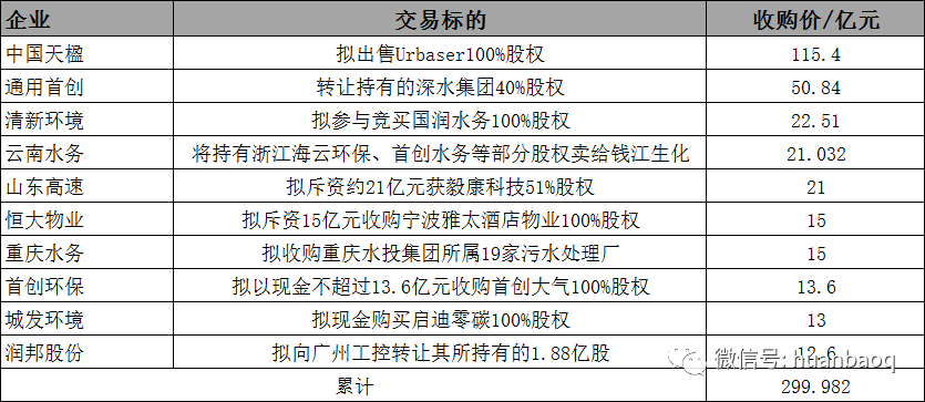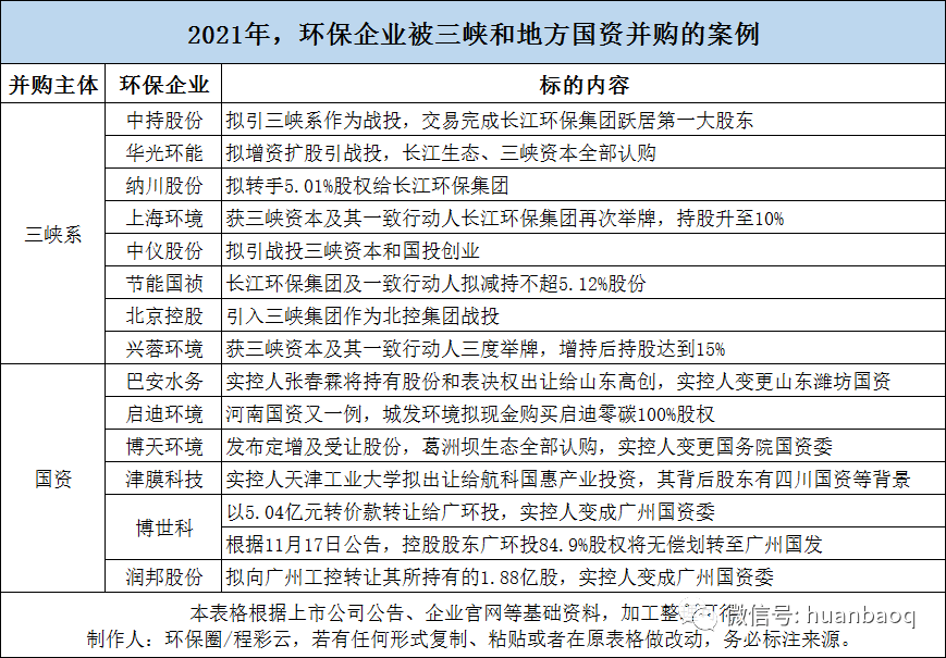 深:影響之深為近年來之最,去年發(fā)生的88起收并購,從某種意義上講已經(jīng)不是某些企業(yè)的戰(zhàn)略進(jìn)與退,也不是傳統(tǒng)行業(yè)跨界環(huán)保這樣簡單,它背后傳遞的信號有央企、國資、民企、外企四股力量的競爭更迭,也有行業(yè)最徹底洗牌、低負(fù)債對高負(fù)債的清算等,意味深遠(yuǎn)。并購頻率之多、交易金額之大,波及范圍之廣,產(chǎn)業(yè)影響之深,讓2021年環(huán)保產(chǎn)業(yè)收并購更加有看頭。在這一年里,我們不僅見證了世界級環(huán)保巨頭“老大并購老二”的一波三折,也領(lǐng)略了三峽、地方國資進(jìn)擊環(huán)保行業(yè)的“兇猛”,還看到了部分民企賣資產(chǎn),國資接盤“混改”大潮的落幕。從2020年8月,威立雅首次提出要收購蘇伊士股份起,直到2021年12月14日,歐盟委員會正式批準(zhǔn)二者收購交易,這場歷時1年零三個月,震驚環(huán)保圈的收購大案也進(jìn)入收尾階段。最終的收購價,威立雅同意以每股20.50歐元的價格收購蘇伊士股份,要比最初的每股15歐元的報價加價不少。(詳情查閱:威立雅蘇伊士簽署合并協(xié)議,“洋水務(wù)”劍指中國市場?)去年6月,中國天楹宣布要15億歐元(折合人民幣約115億元)出售Urbaser 100%股權(quán),9月底就走完了各項流程,10月中下旬就披露完成了所有交割事項,速度非??欤z毫不拖泥帶水。對于這場收購案,媒體評價大都是正面,甚至有的還說中國天楹“里外躺贏”,在持有Urbaser的這些年中,中國天楹不僅在技術(shù)提升、產(chǎn)業(yè)鏈布局、海外業(yè)務(wù)、品牌影響力等方面獲益匪淺,而且通過買賣騰挪,中間除了掙了3.5億歐元投資差價之外,還把公司資產(chǎn)負(fù)債率,商譽(yù)減值風(fēng)險都降低了,簡直是人生贏家。(詳情查閱:中國天楹擬15億歐元出售Urbaser,賠了or賺了?)“一波三折”的城發(fā)環(huán)境換股吸收合并啟迪環(huán)境案,從去年年初一直持續(xù)到8月,才經(jīng)過河南省財政廳及河南省國資委正式批復(fù),中間較為突破的是6月份,城發(fā)環(huán)境宣布擬12.8億元并購啟迪環(huán)境相關(guān)資產(chǎn),其中擬定10億元收購鄭州啟迪零碳100%股權(quán),2.81億元收購武漢啟迪生態(tài)所持的5家下屬公司95%股權(quán)。帶著政治任務(wù)而來的三峽集團(tuán),近兩年不斷擴(kuò)大自己“朋友圈”,一旦被其看上,輕則舉牌增持股份,比如興蓉環(huán)境、上海環(huán)境就多次獲其增持;重則引入戰(zhàn)投,躍居大股東,比如中持,享受項目、訂單上的傾斜。據(jù)筆者不完全統(tǒng)計,2021年,三峽系通過三峽資本以及一致行動人長江生態(tài)環(huán)保集團(tuán),引戰(zhàn)投、舉牌增持上市環(huán)企高達(dá)8家,其中不僅有北控水務(wù)、上海環(huán)境、中持股份、興蓉環(huán)境等水務(wù)龍頭,還有華光環(huán)能、納川股份、中儀股份等細(xì)分領(lǐng)域的“強(qiáng)兵悍將”。最后的這個,不是某一家環(huán)保企業(yè),而是一類環(huán)保企業(yè)。從2018年起,環(huán)保行業(yè)的“混改潮”已經(jīng)持續(xù)了好幾年。本以為這場上市民企易主、國資混改的悲情大戲就要完結(jié)了,誰知去年還是斷斷續(xù)續(xù)有地方國資接盤上市民企案發(fā)生,兜兜轉(zhuǎn)轉(zhuǎn),博世科、巴安水務(wù)、博天環(huán)境、潤邦股份、啟迪環(huán)境終于在去年成功聯(lián)姻國資,抱上了金主大腿。▼圖五:三峽系和地方國資增持并購環(huán)保案例