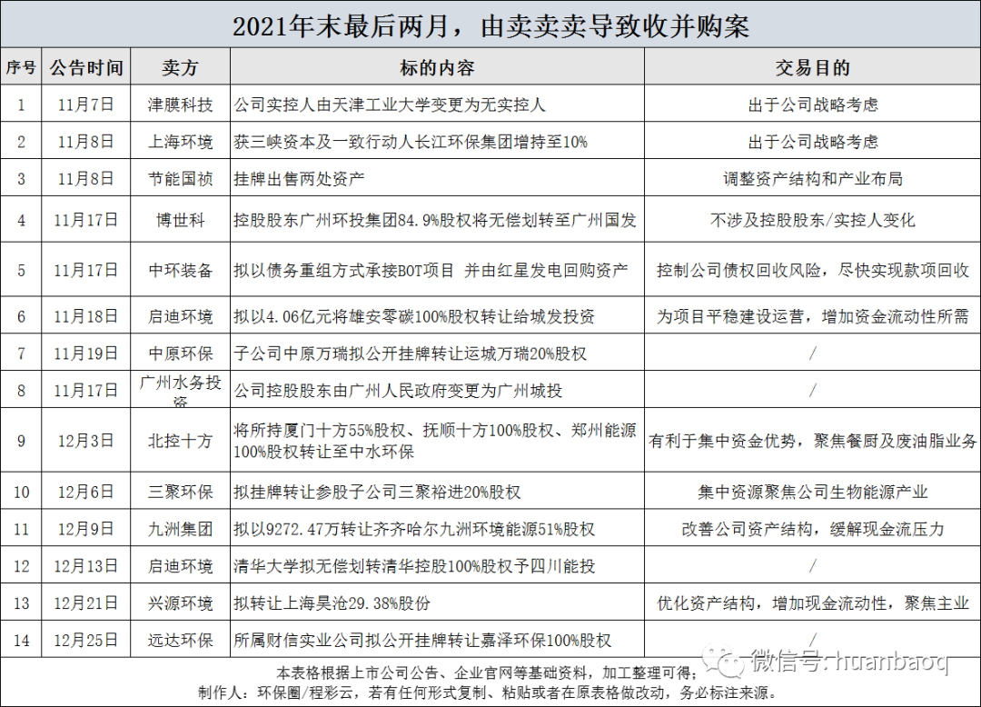 全:類型之全為近年來之最,不同于以往單一跨界并購或者延伸產(chǎn)業(yè)鏈,去年88起并購案交易類型更加全面。既有出于戰(zhàn)略考慮,完善產(chǎn)業(yè)鏈上下游,迅速占領(lǐng)某個地區(qū)市場的;也有極個別傳統(tǒng)產(chǎn)業(yè)跨界轉(zhuǎn)型而來,搶灘環(huán)保的(環(huán)衛(wèi)賽道尤其突出);還有像光大環(huán)境、城發(fā)環(huán)境、海天水務(wù)、高能環(huán)境等優(yōu)質(zhì)企業(yè),為了進(jìn)一步增厚原有項目規(guī)模,直接收購成熟運(yùn)營資產(chǎn)的。但更多的是,不少我們熟知的上市環(huán)企為了降低負(fù)債、保存實力“過冬”、緩解資金流動壓力,開始“賣賣賣”,小至某個污水處理廠、垃圾焚燒廠股權(quán)出售,大至整個公司實控人發(fā)生變更,年末最后兩月累計發(fā)生的26起并購交易案,其中“賣賣賣”占據(jù)一半,高達(dá)14起。▼圖四:年末最后兩月26起并購交易案,“賣賣賣”占據(jù)一半