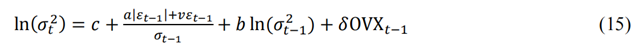 使用EGARCH模型考察原油市場(chǎng)波動(dòng)對(duì)EUA市場(chǎng)影響時(shí),發(fā)現(xiàn)在正態(tài)分布、t分布、GED分布三種假設(shè)下,OVX的系數(shù)全部顯著為正,表示原油價(jià)格波動(dòng)的上升會(huì)導(dǎo)致EUA市場(chǎng)波動(dòng)的增加,引起排放價(jià)格下降。