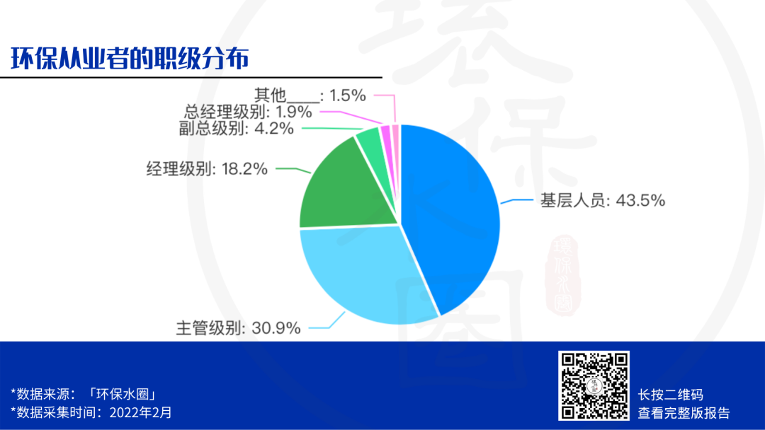 我們對(duì)環(huán)保從業(yè)者的崗位級(jí)別進(jìn)行了調(diào)查,有43.5%的環(huán)保人屬于基層人員,主管級(jí)別的小伙伴占30.9%,經(jīng)理級(jí)別占18.2%。