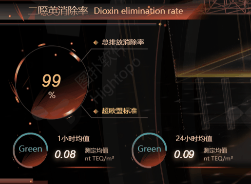 HT 左側(cè)面板循環(huán)播放煙氣污染物控制情況、二噁英消除率、以及安全生產(chǎn)關(guān)鍵指標(biāo)等。