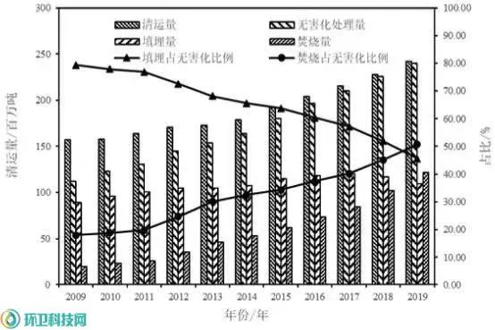 圖1 2009年至2019年城市生活垃圾不同無害化處置技術(shù)處置量及所占比例表1我國城市生活垃圾填埋發(fā)展趨勢(shì)與狀況(2006年~2019年)* 1.2填埋比例