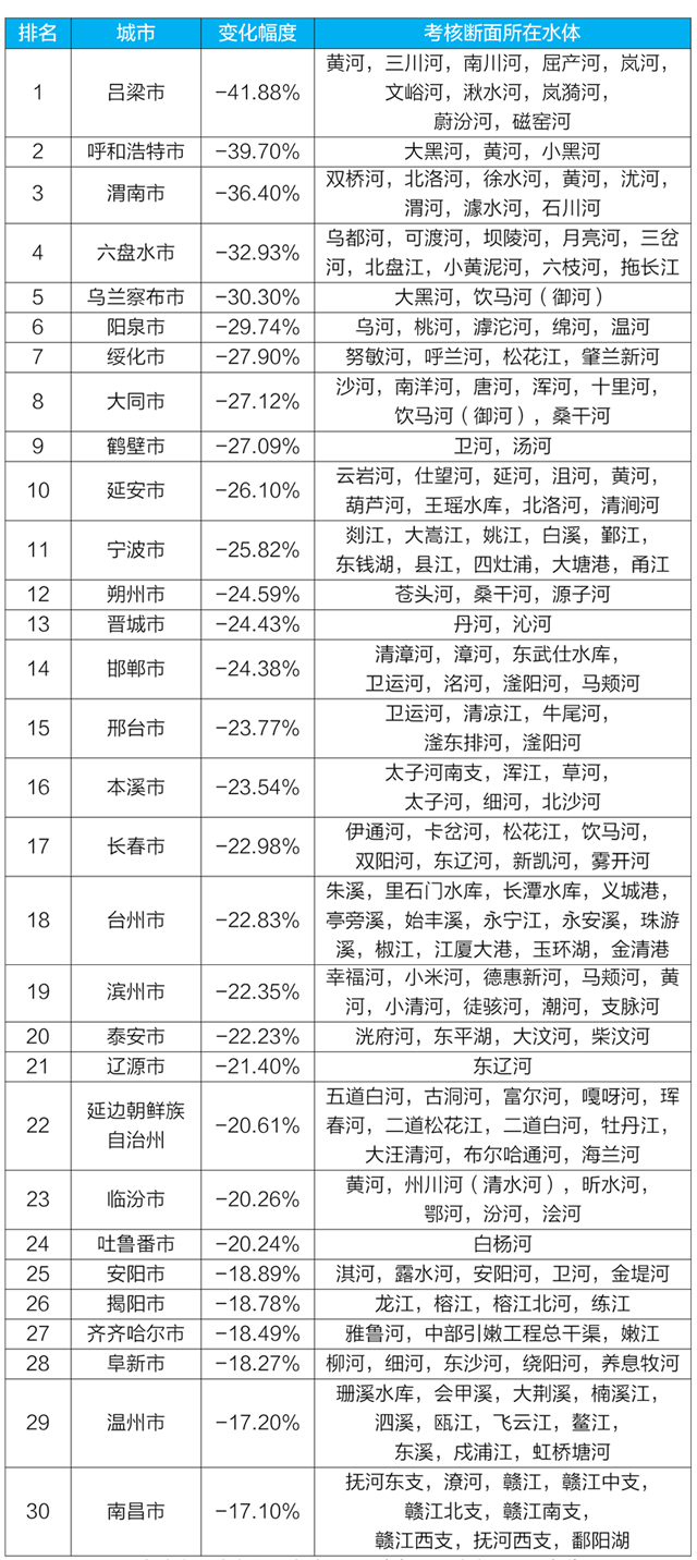 質(zhì)量變化情況排名前30位城市及所在水體