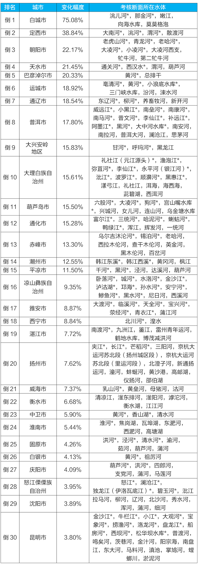 質(zhì)量變化情況排名后30位城市及所在水體