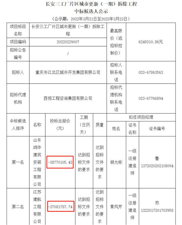 這個奇葩的案例,就是不久前發(fā)布中標(biāo)公告的重慶市長安三工廠片區(qū)城市更新(一期)拆除工程項目。中標(biāo)人為山東鴻華建筑安裝工程有限公司(私企),中標(biāo)金額約為“-3877.01萬元”。更有意思的是,第二中標(biāo)人和第三中標(biāo)人的報價分別為-3708.18萬元和-3517.51萬元,也均為負數(shù)。