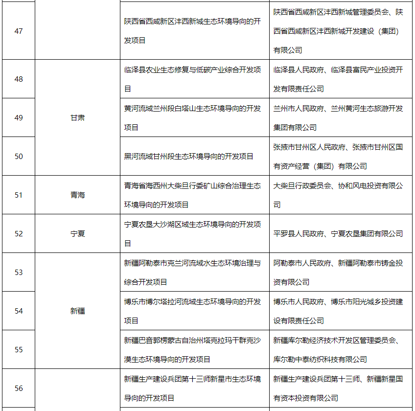 同時(shí),對(duì)于第二批試點(diǎn),3部門還提出了4點(diǎn)要求。?1、認(rèn)真貫徹國家有關(guān)生態(tài)環(huán)境治理模式創(chuàng)新和環(huán)保產(chǎn)業(yè)發(fā)展要求在試點(diǎn)工作開展過程中積極探索,創(chuàng)新生態(tài)環(huán)境治理項(xiàng)目組織實(shí)施方式,促進(jìn)生態(tài)環(huán)境高水平保護(hù)和區(qū)域經(jīng)濟(jì)高質(zhì)量發(fā)展。省級(jí)生態(tài)環(huán)境、發(fā)展改革部門等試點(diǎn)推進(jìn)單位加強(qiáng)對(duì)試點(diǎn)工作的督促指導(dǎo),對(duì)試點(diǎn)工作中發(fā)現(xiàn)的問題要及時(shí)予以糾正,推進(jìn)試點(diǎn)工作規(guī)范實(shí)施。國家開發(fā)銀行有關(guān)分行對(duì)符合條件的試點(diǎn)項(xiàng)目,按照精準(zhǔn)施策、市場化運(yùn)作和風(fēng)險(xiǎn)可控原則,發(fā)揮開發(fā)性金融大額中長期資金優(yōu)勢,統(tǒng)籌考慮經(jīng)濟(jì)效益和環(huán)境效益,在資源配置上予以傾斜,加大支持力度。也就是說,省級(jí)環(huán)保部門和發(fā)改部門要加強(qiáng)指導(dǎo)監(jiān)督,而國開行有關(guān)分行則要在資源分配上予以傾斜,加大支持。試點(diǎn)實(shí)施單位是試點(diǎn)工作的責(zé)任主體,要嚴(yán)格履行試點(diǎn)實(shí)施承諾,不以試點(diǎn)名義突破現(xiàn)有法律法規(guī)政策等要求,嚴(yán)格落實(shí)招投標(biāo)、政府采購、投融資、土地、資源開發(fā)、空間管控、資產(chǎn)處置等各項(xiàng)法規(guī)政策,不以任何形式增加地方政府隱性債務(wù)。采用合法合規(guī)方式選擇具備較強(qiáng)產(chǎn)業(yè)投資運(yùn)營能力的項(xiàng)目實(shí)施主體,由一個(gè)主體一體化實(shí)施,確保產(chǎn)業(yè)開發(fā)項(xiàng)目持續(xù)運(yùn)營。這一條,是有關(guān)風(fēng)險(xiǎn)防范的條款,告知試點(diǎn)實(shí)施單位要注意控制政府隱性債務(wù),依法開展試點(diǎn)。?3、強(qiáng)化項(xiàng)目收益內(nèi)部反哺機(jī)制試點(diǎn)實(shí)施單位切實(shí)加強(qiáng)公益性生態(tài)環(huán)境治理項(xiàng)目與相關(guān)經(jīng)營性產(chǎn)業(yè)開發(fā)項(xiàng)目一體化融合實(shí)施。在項(xiàng)目邊界范圍內(nèi)實(shí)現(xiàn)產(chǎn)業(yè)開發(fā)項(xiàng)目對(duì)生態(tài)環(huán)境治理項(xiàng)目建設(shè)與運(yùn)營的持續(xù)性收益反哺。實(shí)施中可適當(dāng)優(yōu)化試點(diǎn)依托項(xiàng)目,加強(qiáng)產(chǎn)業(yè)收益對(duì)生態(tài)環(huán)境治理的反哺力度,減少政府資金投入,力爭實(shí)現(xiàn)政府資金“零投入”。大家知道,EOD項(xiàng)目都是“肥瘦搭配”,這一條就是要求“肥”項(xiàng)目要加強(qiáng)反哺“瘦”項(xiàng)目,從而減少政府資金投入,最好是實(shí)現(xiàn)政府資金“零投入”,應(yīng)該說這才是EOD模式的“初心”。試點(diǎn)實(shí)施單位加強(qiáng)統(tǒng)籌,及時(shí)總結(jié)經(jīng)驗(yàn)做法,探索形成可復(fù)制、可推廣的生態(tài)環(huán)境治理創(chuàng)新模式。按照《關(guān)于開展生態(tài)環(huán)境導(dǎo)向的開發(fā)模式試點(diǎn)定期調(diào)度的通知》要求,試點(diǎn)實(shí)施單位于每季度首月10日前將試點(diǎn)項(xiàng)目季度實(shí)施進(jìn)度情況表報(bào)送生態(tài)環(huán)境部科技與財(cái)務(wù)司。試點(diǎn)期內(nèi)每年12月底前將年度進(jìn)展情況報(bào)告報(bào)請(qǐng)省級(jí)生態(tài)環(huán)境、發(fā)展改革部門審查后,由兩部門上報(bào)生態(tài)環(huán)境部、國家發(fā)展改革委,抄報(bào)國家開發(fā)銀行。既然是試點(diǎn),最重要的任務(wù)肯定就是摸索經(jīng)驗(yàn)、探索模式,從而有利于以后的推廣,這一條就是關(guān)于這方面的規(guī)定。總的來看,第二批EOD模式試點(diǎn),國家的要求并不算很多,還是以探索為主,希望能夠形成可復(fù)制、可推廣的經(jīng)驗(yàn)。所以入選項(xiàng)目也可以盡可能地放開手腳,大膽試驗(yàn)。第一批試點(diǎn)授信額度達(dá)644億元