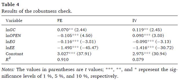 為了緩解模型中存在的由變量缺失或綠色信貸測量誤差引起的內(nèi)生問題,本研究采用綠色信貸的一階滯后項(xiàng)作為工具變量。表3中報告的工具變量法(IV)產(chǎn)生的估計結(jié)果與固定效應(yīng)模型基本一致??刂谱兞康南禂?shù)和顯著性水平也與之前的結(jié)果一致。