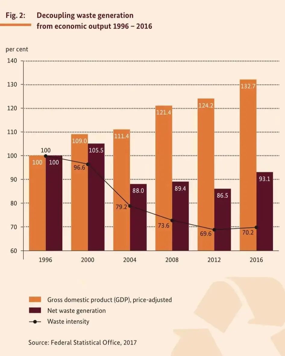 廢棄物管理體系的五個(gè)階段是避免產(chǎn)生、再利用、再循環(huán)、回收和處置。避免產(chǎn)生對環(huán)境產(chǎn)生的危害最小,最終處置對環(huán)境影響相對較高最大。目前,德國生活垃圾回收利用比例已經(jīng)達(dá)到67%。