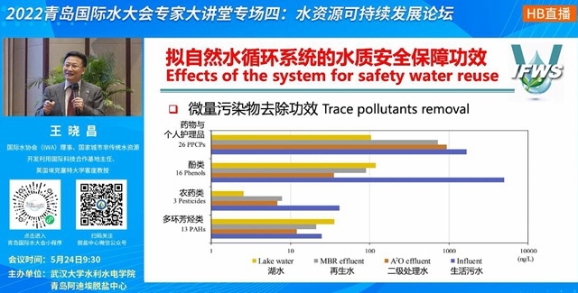 從微量污染物去除功效來看,PPCPs在景觀湖中能得到有效去除;從生物毒性控制功效上來看,景觀湖也有效控制了各類生物毒性,而水回用的水質(zhì)安全得到了有效保障。其自然作用機制,①是吸附作用,②是光解作用,③是水生生物凈化作用。王曉昌教授表示,構(gòu)建擬自然水循環(huán)系統(tǒng)是污水資源化利用未來的發(fā)展方向,其水質(zhì)安全保障功效已經(jīng)在實踐中得到了驗證。