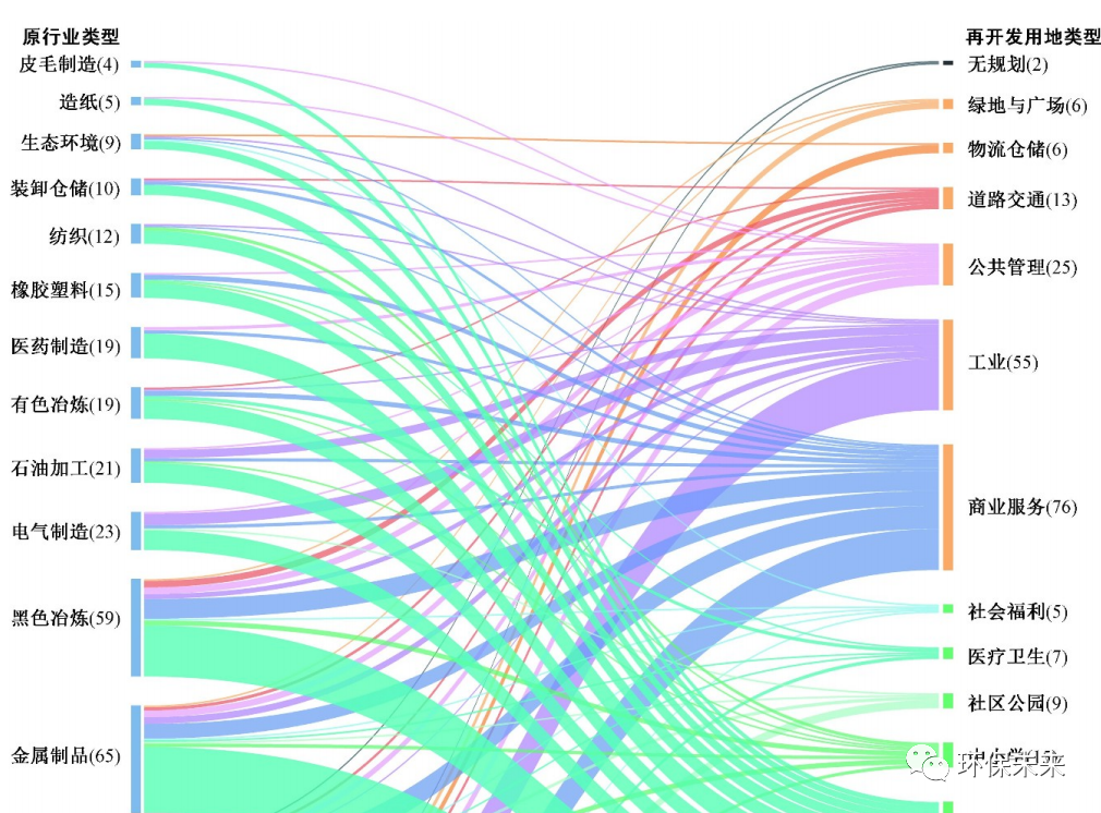 從場地數(shù)量的時間變化趨勢看,近 10 年來我國污染場地修復(fù)與管控工作發(fā)展快速. 通過對 2011?2021 年污染場地修復(fù)案例進行統(tǒng)計分析 (見圖 1) 發(fā)現(xiàn),場地數(shù)量整體上隨時間的推移呈先增加后降低的趨勢. 從前 5 年 (2011?2015 年) 的 16 個場地逐步增至 2018 年的 131 個,后者是前者的 8.2 倍,這與近些年我國政府密集出臺的污染場地相關(guān)政策法規(guī)和城市土地資源需求與配置有關(guān). 圖 1 顯示,2016 年以來,我國場地修復(fù)管控數(shù)量增勢凸顯,主要原因可能是我國對污染場地土壤環(huán)境質(zhì)量的高度重視,同時出臺了一系列有關(guān)污染場地管理的政策及技術(shù)導(dǎo)則,國務(wù)院于 2016 年 5 月發(fā)布《土十條》,大大推動了我國污染場地修復(fù)管控事業(yè)的發(fā)展[22]. 2018 年污染場地修復(fù)管控數(shù)量達到頂峰,這與我國頒布的一系列利好政策有關(guān)系,如頒布實施了《土壤污染防治法》以及GB 36600?2018. 在 2019?2020 年這 2 年間,每年污染場地修復(fù)管控數(shù)量超過 110 個,約是前 5 年修復(fù)管控數(shù)量的 6.9 倍;2021 年污染場地修復(fù)管控案例中只收集到 42 個場地. 總體來說,國家相關(guān)政策法規(guī)的出臺有效促進了我國污染場地修復(fù)管控工作的發(fā)展進程,尤其是經(jīng)濟欠發(fā)達地區(qū).2.2 場地所屬行業(yè)與污染物管控指標的耦合分析《土十條》中明確要求對有色金屬冶煉、石油加工、化工、焦化、電鍍、制革等重點行業(yè)企業(yè)用地,以及未來土地利用類型為居住和商業(yè)、學校、醫(yī)療、養(yǎng)老機構(gòu)等公共設(shè)施的企業(yè)用地,開展土壤環(huán)境狀況調(diào)查與風險評估. 污染場地的歷史用地類型決定了其特征污染物,因此,識別污染場地的特征污染物是場地土壤環(huán)境狀況調(diào)查與風險評估的重要環(huán)節(jié). 污染場地涉及行業(yè)企業(yè)類型廣泛,包括 40 個國民經(jīng)濟大類行業(yè),由于個別行業(yè)類別場地數(shù)量較少,且根據(jù)經(jīng)驗判斷,其環(huán)境危害性較小,因此將行業(yè)類別主要劃分為化學原料和化學制品制造業(yè) (化學工業(yè)),金屬制品業(yè) (金屬制品),黑色金屬冶煉和壓延加工業(yè) (黑色冶煉),有色金屬冶煉和壓延加工業(yè) (有色冶煉),電氣機械和器材制造業(yè) (電氣制造),醫(yī)藥制造業(yè) (醫(yī)藥制造),石油、煤炭及其他燃料加工業(yè) (石油加工),橡膠和塑料制品業(yè) (橡膠塑料),紡織業(yè) (紡織),生態(tài)保護和環(huán)境治理業(yè) (生態(tài)環(huán)境),裝卸搬運和倉儲業(yè) (裝卸倉儲),造紙和紙制品業(yè) (造紙),皮革、毛皮、羽毛及其制品和制鞋業(yè) (皮毛制造),以及其他,共 14 個行業(yè)類別(見圖 2、3). 該研究調(diào)查的 537 個污染場地中修復(fù)/管控污染場地數(shù)量最多的行業(yè)是化學工業(yè) (為 155 個,占 32.9%),其次為金屬制品、黑色冶煉、有色冶煉、電氣制造和醫(yī)藥制造,場地數(shù)量分別為 60、54、19、18 和 18 個 (見圖 3). 我國早期產(chǎn)業(yè)結(jié)構(gòu)中制造業(yè)和重工業(yè)占據(jù)主導(dǎo)地位,當時主要發(fā)展采礦、金屬冶煉、化工制造、鋼鐵生產(chǎn)等行業(yè)[23]. 這些行業(yè)存在涉重金屬原料使用量大、污染物排放多及在生產(chǎn)過程中操作不規(guī)范等原因,通過各種途徑使污染物在土壤中富集,對場地土壤環(huán)境造成了較大影響,因此這些企業(yè)成為修復(fù)/管控的優(yōu)先考慮對象[24].
