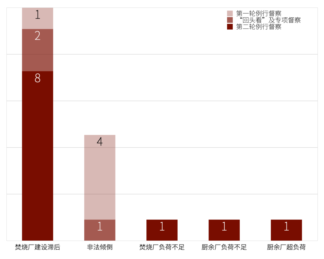 還有一些生活垃圾問(wèn)題在新的垃圾管理模式下爆發(fā)。其中,焚燒廠建設(shè)滯后問(wèn)題在第一次例行督察、“回頭看”及專(zhuān)項(xiàng)督察和第二次例行督察分別出現(xiàn)1次、2次、8次,愈演愈烈;還有一些生活垃圾問(wèn)題在2020年5月至2022年6月期間的第二輪例行督察中首次出現(xiàn),比如焚燒廠負(fù)荷不足、廚余廠負(fù)荷不足、廚余廠超負(fù)荷。