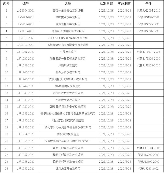 2021年12月30日,市場監(jiān)管總局發(fā)布了24項國家計量技術(shù)規(guī)范,均自2022年6月28日起實施。
