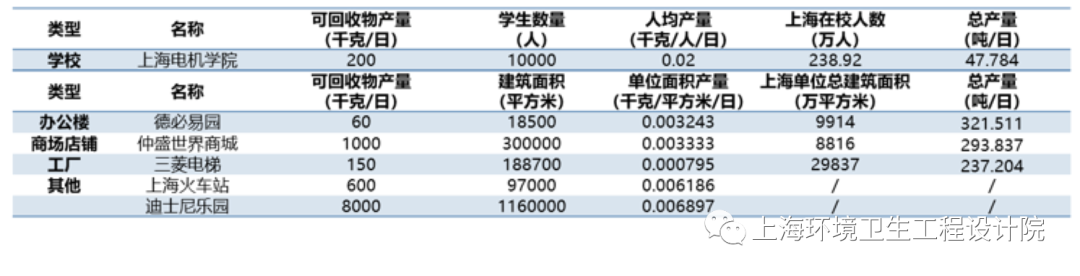 為了解不同類型單位可回收物產(chǎn)量,2020年6月-9月本研究團(tuán)隊(duì)開(kāi)展了學(xué)校、辦公樓、商場(chǎng)店鋪、工廠、交通樞紐、游樂(lè)園等6個(gè)典型企事業(yè)單位可回收物產(chǎn)量調(diào)研。
