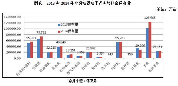 廢棄電器電子產(chǎn)品理論報(bào)廢量的測算為行業(yè)管理提供重要的依據(jù)。根據(jù)國家統(tǒng)計(jì)年鑒電器電子產(chǎn)品居民百戶擁有量與居民戶數(shù)測算的居民保有量見下圖。除固定電話和黑白電視機(jī)之外,其他產(chǎn)品均逐年增長,其中移動(dòng)電話的增長速度最高。中投顧問發(fā)布的《2017-2021年中國電子廢棄物處理行業(yè)深度調(diào)研及投資前景預(yù)測報(bào)告》指出,2013和2014年中國電器電子產(chǎn)品的社會(huì)保有量持續(xù)上升,社會(huì)保有量是根據(jù)電器電子產(chǎn)品銷量與對(duì)于該年報(bào)廢系數(shù)乘積的方法進(jìn)行的測算。