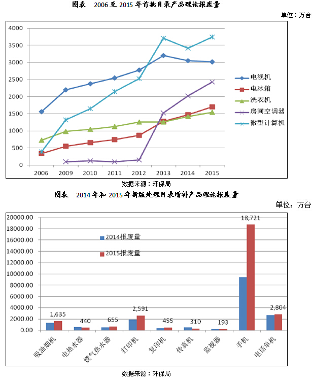 2015年首批目錄產(chǎn)品的理論報(bào)廢量增幅放緩,同比增加9.32%。在政策激勵(lì)下,從2013年開始,電冰箱、洗衣機(jī)、房間空調(diào)器和微型計(jì)算機(jī)的理論報(bào)廢量逐年上漲,但電視機(jī)的理論報(bào)廢量小幅下降。2015年,新增目錄產(chǎn)品中手機(jī)的理論報(bào)廢量同比增加約50%。