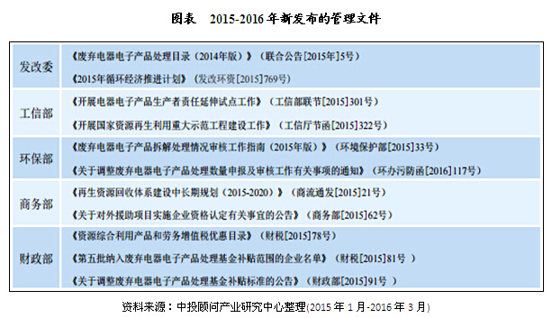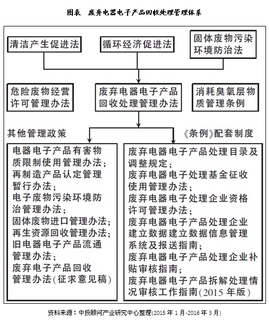 中投顧問發(fā)布的《2017-2021年中國電子廢棄物處理行業(yè)深度調研及投資前景預測報告》指出,我國廢棄電器電子產品回收處理的管理包括再生資源和環(huán)境保護兩個領域,涉及電器電子產品的綠色設計與制造、再制造、回收、處理和資源綜合利用和處置多個環(huán)節(jié)。從人大立法、國務院《廢棄電器電子產品回收處理管理條例》、到主管部委的管理辦法和規(guī)章、標準,已經形成一個至上而下的較為完善的管理體系。
