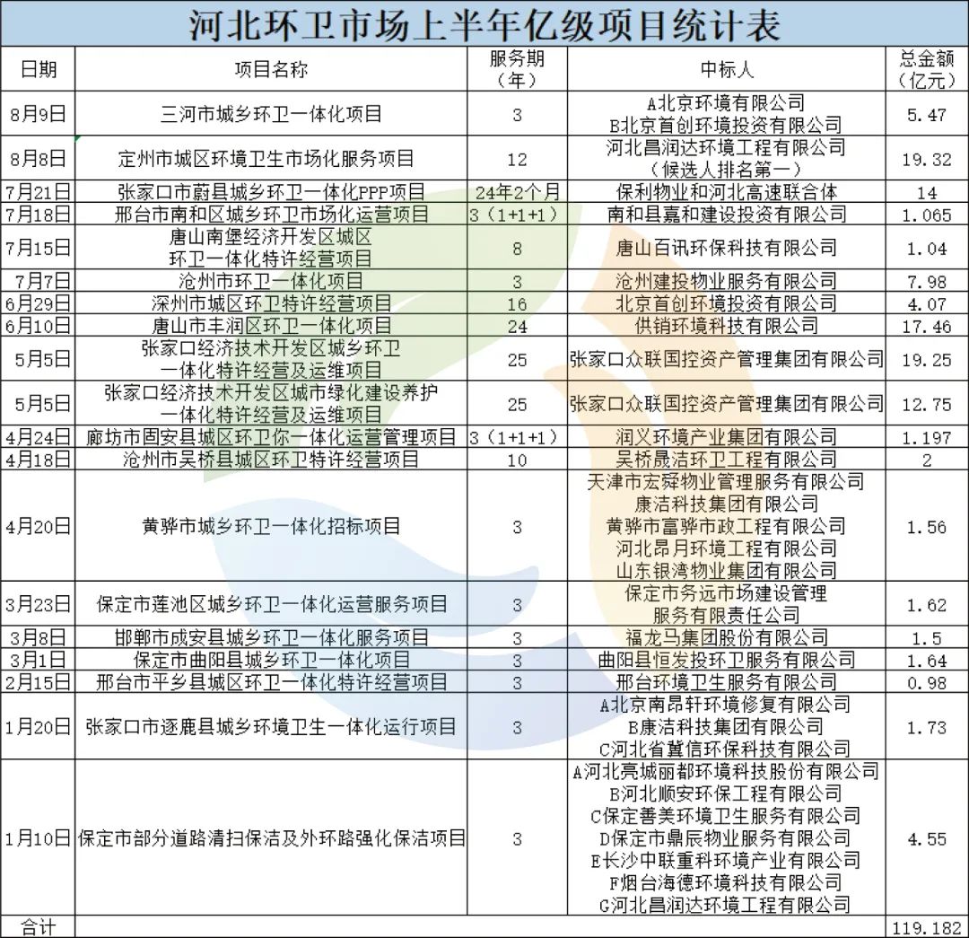據(jù)《環(huán)保圈》不完全統(tǒng)計(jì),2022年1月至今,河北省已開標(biāo)19個(gè)億級環(huán)衛(wèi)項(xiàng)目,中標(biāo)金額合計(jì)119.18億元。(注:數(shù)據(jù)來源為中國政府采購網(wǎng)及各地政府采購網(wǎng)、招投標(biāo)公共服務(wù)平臺等)而據(jù)環(huán)衛(wèi)科技網(wǎng)歷史數(shù)據(jù),2021年全年,河北環(huán)衛(wèi)市場僅開標(biāo)6個(gè)億級項(xiàng)目,總金額約為14億元。如今,2022年才過7個(gè)多月,中標(biāo)金額就增長了7.5倍??梢姡颖笔〗衲戥h(huán)衛(wèi)項(xiàng)目釋放量和項(xiàng)目體量較往年都有飛躍式的增長。而從河北各個(gè)地區(qū)來看,當(dāng)屬張家口市項(xiàng)目釋放量最多,共計(jì)開標(biāo)4個(gè)項(xiàng)目,中標(biāo)金額合計(jì)47.73億元,約占19個(gè)項(xiàng)目總金額的40%。從中標(biāo)企業(yè)上看,共計(jì)29家企業(yè)榜上有名。其中,外地企業(yè)12家,占比約41%。外地企業(yè)對河北環(huán)衛(wèi)市場的“侵蝕”程度可見一斑。此外,中標(biāo)金額排名前5的項(xiàng)目中,排名3、4的唐山市豐潤區(qū)項(xiàng)目和張家口市蔚縣項(xiàng)目,中標(biāo)人分別為供銷環(huán)境科技有限公司和保利物業(yè)(牽頭人),均為外地企業(yè)。這兩個(gè)項(xiàng)目的中標(biāo)金額之和為此5個(gè)大項(xiàng)目總金額的38%。可見,在上半年的環(huán)衛(wèi)大標(biāo)爭奪上,外地企業(yè)還是能搶占一席之地的。另一個(gè)值得關(guān)注的是,在今年的河北環(huán)衛(wèi)市場上,國資控股企業(yè)頗有幾分大放異彩的意味,人數(shù)雖少,卻屢屢奪得大標(biāo)。29家企業(yè)中,有8個(gè)中標(biāo)人為國資控股企業(yè),此8家企業(yè)中標(biāo)金額合計(jì)65.98億元,占總金額的55%。如32億元的張家口經(jīng)濟(jì)技術(shù)開發(fā)區(qū)2個(gè)項(xiàng)目中標(biāo)人為張家口眾聯(lián)國控資產(chǎn)管理集團(tuán)有限公司;超17億元的唐山市豐潤區(qū)環(huán)衛(wèi)一體化項(xiàng)目中標(biāo)人為供銷環(huán)境科技有限公司;近8億元的滄州市環(huán)衛(wèi)一體化項(xiàng)目中標(biāo)人為滄州建投物業(yè)服務(wù)有限公司等,中標(biāo)人均為國資控股。除了已經(jīng)中標(biāo)的項(xiàng)目,目前河北省在招標(biāo)的億級環(huán)衛(wèi)項(xiàng)目還有5個(gè),預(yù)算金額合計(jì)超11億元,加上已中標(biāo)項(xiàng)目,整個(gè)河北省環(huán)衛(wèi)項(xiàng)目釋放量已超130億元。與大刀闊斧發(fā)布新項(xiàng)目的前端環(huán)衛(wèi)市場一致的是,河北末端環(huán)衛(wèi)市場也呈現(xiàn)出了一派欣欣向榮的景象。公開信息顯示,2021年底,河北省已經(jīng)建成69座生活垃圾焚燒發(fā)電廠,全省焚燒總處理能力達(dá)6.75萬噸/日,位居全國前列。2022年3月20日,《河北省“十四五”時(shí)期“無廢城市”建設(shè)工作方案》(以下稱《方案》)下發(fā),提出積極推進(jìn)生活垃圾無害化處理,加快生活垃圾焚燒處理設(shè)施建設(shè),加強(qiáng)生活垃圾填埋場封場治理,實(shí)現(xiàn)原生生活垃圾“零填埋”。頂層方案的加碼,讓河北省生活垃圾末端處置的各個(gè)項(xiàng)目加快了速度。據(jù)河北省住房和城鄉(xiāng)建設(shè)廳消息,截止今年7月,河北省計(jì)劃建成的17座生活垃圾焚燒處理設(shè)施已完成總工程量的67%,已關(guān)停生活垃圾填埋場121座,126座填埋場治理任務(wù)已開工54座、完工2座,全省生活垃圾焚燒處理率達(dá)到90%以上。從這些計(jì)劃實(shí)施的進(jìn)程來看,河北省一直在持續(xù)性推進(jìn)生活垃圾無害化處理工程,補(bǔ)齊生活垃圾焚燒處理能力短板,加快垃圾焚燒處理設(shè)施建設(shè)??傮w來說,該省生活垃圾末端處置市場未來的發(fā)展態(tài)勢是一片大好。在末端處置的其他方面,河北建筑垃圾資源化利用市場也隨著各項(xiàng)政策的下發(fā)沸騰了起來。2022年1月25日,河北省《關(guān)于支持建筑垃圾資源化利用若干政策措施》下發(fā),提出了三大方面十七項(xiàng)政策措施。文件要求,建筑垃圾處置費(fèi)收費(fèi)標(biāo)準(zhǔn)原則上不低于6元/m3。房屋建筑工程中使用再生砌塊(磚)等產(chǎn)品占同種類產(chǎn)品的比例不低于10%;市政基礎(chǔ)設(shè)施工程中使用再生粗骨料、再生砌塊(磚)、再生瀝青混凝土等產(chǎn)品占同種類產(chǎn)品的比例不低于20%。此外,鼓勵(lì)在房屋建筑、市政基礎(chǔ)設(shè)施、交通基礎(chǔ)設(shè)施、海綿城市、園林景觀等各類工程建設(shè)中,優(yōu)先選用符合技術(shù)標(biāo)準(zhǔn)和設(shè)計(jì)、質(zhì)量要求的建筑垃圾再生產(chǎn)品。政府投資或以政府投資為主的工程項(xiàng)目,優(yōu)先使用建筑垃圾再生產(chǎn)品,做到能用盡用。2022年3月16日,河北省住房和城鄉(xiāng)建設(shè)廳對《河北省建筑垃圾資源化利用技術(shù)導(dǎo)則》公開征求意見,4月6日,該《導(dǎo)則(2022年版)》正式發(fā)布,主要包括建筑垃圾資源化利用方案策劃、分類收集、運(yùn)輸與轉(zhuǎn)運(yùn)、處理、再生產(chǎn)品的應(yīng)用等內(nèi)容。《導(dǎo)則》在2019年版基礎(chǔ)上增加了方案策劃、水泥窯協(xié)同處置建筑垃圾、再生骨料用于水處理生物填料等內(nèi)容。導(dǎo)則提出,建筑垃圾應(yīng)從源頭分類,應(yīng)按成分進(jìn)行資源化利用,處理全過