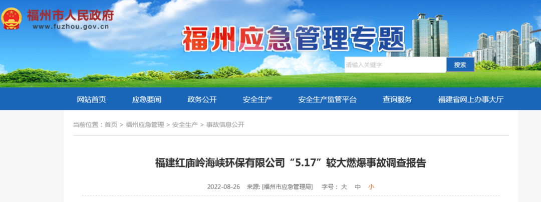 2022年5月17日上午8時54分,福建紅廟嶺海峽環(huán)保有限公司10萬方調(diào)節(jié)池上方外包作業(yè)人員違規(guī)用氬弧焊對除臭設(shè)施風(fēng)管漏點進行焊接施工時發(fā)生燃爆,造成3人死亡,3人受傷,5#、6#池頂蓋坍塌,池頂除臭裝置損壞,直接經(jīng)濟損失約1800萬元。事故發(fā)生后,尹力書記、趙龍省長、郭寧寧常務(wù)副省長、林文斌副省長等領(lǐng)導(dǎo)第一時間做出重要批示,要求全力搜救失聯(lián)人員,全力搶救受傷人員;嚴格救援現(xiàn)場管控,防止發(fā)生次生災(zāi)害;查明原因,舉一反三,排查隱患,防范類似事故發(fā)生;做好善后工作。省委常委、市委林寶金書記、省應(yīng)急廳伍斌廳長、吳賢德市長、省建設(shè)廳王明炫副廳長等領(lǐng)導(dǎo)到場指導(dǎo)應(yīng)急救援。省消防救援總隊高寧宇總隊長、蘇作琴副總隊長率領(lǐng)總隊全勤指揮部到場指揮救援行動。林中麟常務(wù)副市長全時指揮市應(yīng)急局、市消防救援支隊、市城管委、市衛(wèi)健委、市公安局、晉安區(qū)委區(qū)政府及多支民間救援隊進行現(xiàn)場救援。根據(jù)《生產(chǎn)安全事故報告和調(diào)查處理條例》(國務(wù)院令第493號),經(jīng)市政府授權(quán),市應(yīng)急管理局牽頭市城管委、市公安局、市總工會、晉安區(qū)政府成立市政府福建紅廟嶺海峽環(huán)保有限公司“5.17”燃爆較大事故調(diào)查組(以下簡稱事故調(diào)查組),聘請3名專家參與調(diào)查,并邀請市紀委監(jiān)委派員參加。事故調(diào)查組按照“四不放過”和“科學(xué)嚴謹、依法依規(guī)、實事求是、注重實效”的原則,通過現(xiàn)場勘查、技術(shù)鑒定、調(diào)查取證、專家論證、人員問詢、調(diào)閱資料、問題核實和綜合分析,查明了事故發(fā)生的經(jīng)過、原因、應(yīng)急救援、人員傷亡情況和直接經(jīng)濟損失,認定了事故性質(zhì)和責(zé)任,提出了對相關(guān)責(zé)任人員及責(zé)任單位的處理建議及防范整改措施建議。(一)福建紅廟嶺海峽環(huán)保有限公司。成立于2014年02月21日,注冊資本為500萬人民幣,法定代表人為徐國丹,經(jīng)營狀態(tài)為存續(xù),工商注冊號為350100100368616,注冊地址為福州市晉安區(qū)鼓山鎮(zhèn)洋里路16號綜合樓一樓107室,經(jīng)營范圍包括城市污水處理及其再生利用;垃圾滲瀝液收集及處理、環(huán)境污染治理設(shè)施的投資、建設(shè)、運營;城市餐廚垃圾處理;環(huán)境污染治理設(shè)施運營咨詢服務(wù)及技術(shù)服務(wù)(依法須經(jīng)批準的項目,經(jīng)相關(guān)部門批準后方可開展經(jīng)營活動)。為福建海峽環(huán)保集團股份有限公司獨立法人的全資子公司,10萬方新調(diào)節(jié)池項目的實際管理單位。(二)福建致辰宇洋環(huán)??萍加邢薰?。成立于2015年3月12日,注冊資本為1000萬人民幣,法定代表人為俞果,經(jīng)營狀態(tài)為存續(xù),工商注冊號為350100100432860,注冊地址為福州市晉安區(qū)新店鎮(zhèn)秀山路245號索高廣場4#樓1層101單元,經(jīng)營范圍包括一般項目:大氣污染治理;水污染治理;生態(tài)環(huán)境監(jiān)測及檢測儀器儀表銷售;大氣污染監(jiān)測及檢測儀器儀表銷售;海洋水質(zhì)與生態(tài)環(huán)境監(jiān)測儀器設(shè)備銷售;環(huán)境保護監(jiān)測;水質(zhì)污染物監(jiān)測及檢測儀器儀表銷售等(除依法須經(jīng)批準的項目外,憑營業(yè)執(zhí)照依法自主開展經(jīng)營活動)。受福建紅廟嶺海峽環(huán)保有限公司委托對10萬方新調(diào)節(jié)池進行除臭設(shè)施提升。(三)福建省偉邦市政環(huán)保工程設(shè)計研究院有限公司,成立于2006-04-26,注冊資本為300萬人民幣,法定代表人為劉建偉,經(jīng)營狀態(tài)為開業(yè),工商注冊號為350100100173044,注冊地址為福州市鼓樓區(qū)工業(yè)路611號福建高新技術(shù)創(chuàng)業(yè)園主樓4層北6房,經(jīng)營范圍包括市政、環(huán)保工程技術(shù)咨詢、設(shè)計,市政、環(huán)保設(shè)備儀器儀表研發(fā)、推廣、銷售,環(huán)保生物廢水處理劑的研發(fā)、推廣、銷售,市政環(huán)保工程承包建設(shè)。(依法須經(jīng)批準的項目,經(jīng)相關(guān)部門批準后方可開展經(jīng)營活動)。該公司投資入股福建致辰宇洋環(huán)??萍加邢薰境袛埖?0萬方新調(diào)節(jié)池的除臭設(shè)施提升項目;受福建致辰宇洋環(huán)??萍加邢薰镜姆ㄈ舜碛峁?,該公司工程師陳連文負責(zé)10萬方新調(diào)節(jié)池的除臭設(shè)施提升項目具體管理。(四)福州嘉鑫華強金屬制品有限公司。成立于2018-06-15,注冊資本為200萬人民幣,法定代表人為羅維嘉,經(jīng)營狀態(tài)為存續(xù),工商注冊號為350121100236032,注冊地址為福建省福州市閩侯縣祥謙鎮(zhèn)林森大道28號,經(jīng)營范圍包括金屬制品、工藝品、建筑材料、家具的加工;家具、文體用品、日用百貨、五金交電的銷售及通過互聯(lián)網(wǎng)銷售。(依法須經(jīng)批準的項目,經(jīng)相關(guān)部門批準后方可開展經(jīng)營活動)。陳連文聯(lián)系該單位為10萬方新調(diào)節(jié)池除臭設(shè)施提升項目制作配套風(fēng)管。(五)福州市紅廟嶺垃圾綜合處理中心,該單位為福州市城市管理委員會直屬事業(yè)單位,主要職責(zé)為承擔(dān)對生活垃圾進行無害化處理和綜合利用工作。設