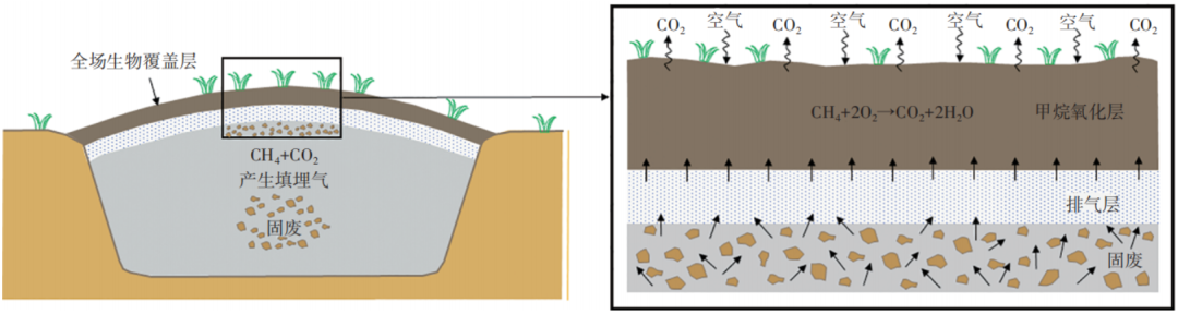 生態(tài)型土質(zhì)覆蓋層具有良好的閉氣功能,能夠有效降低填埋氣排放。同時由于土體多孔的特性,生態(tài)型土質(zhì)覆蓋層不會完全阻斷填埋氣向大氣遷移,而且覆蓋層土壤中廣泛存在分解污染性填埋氣的微生物,這些微生物以污染性填埋氣為“糧食”,能夠?qū)崿F(xiàn)填埋場長效碳減排(圖6)。