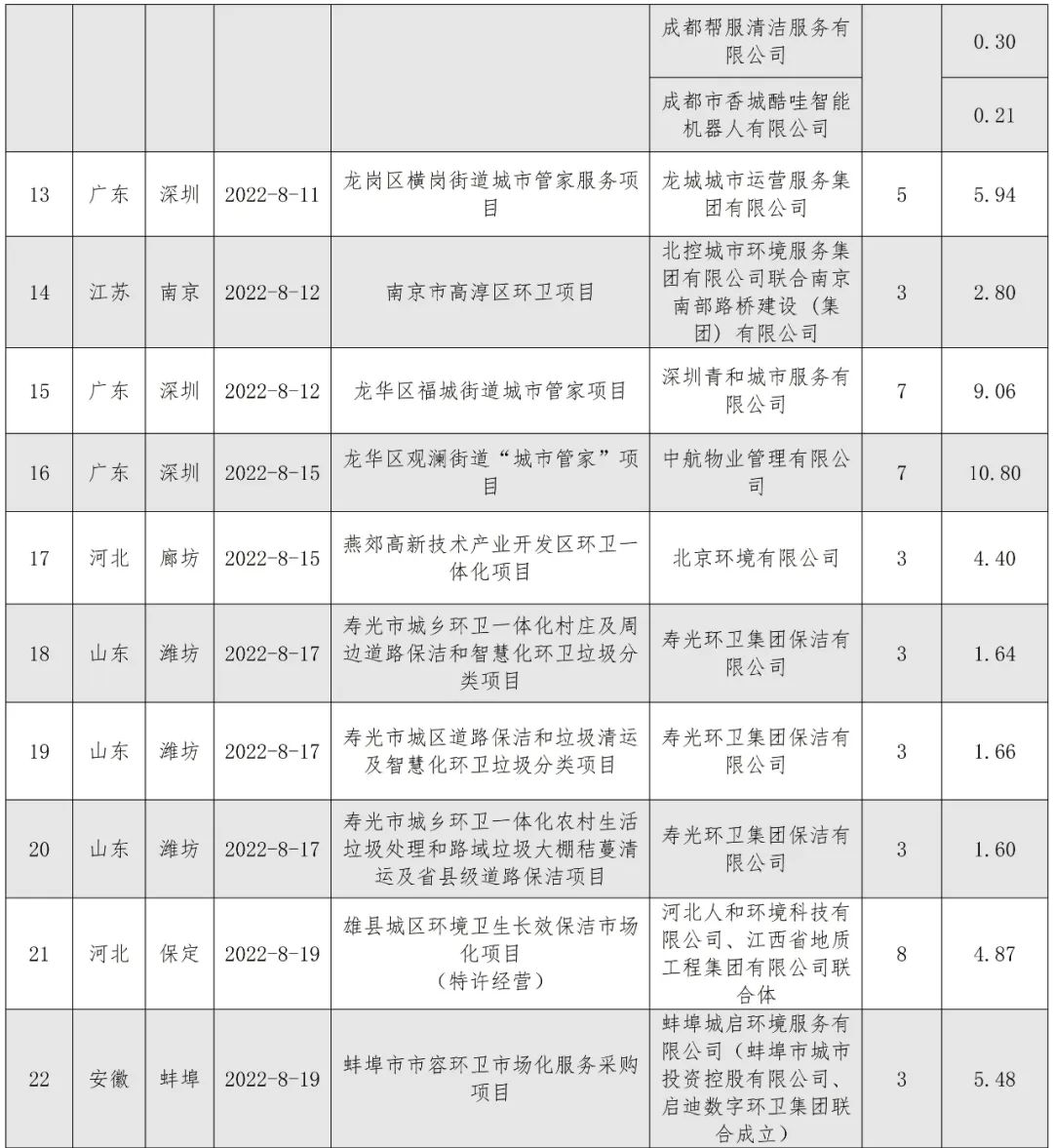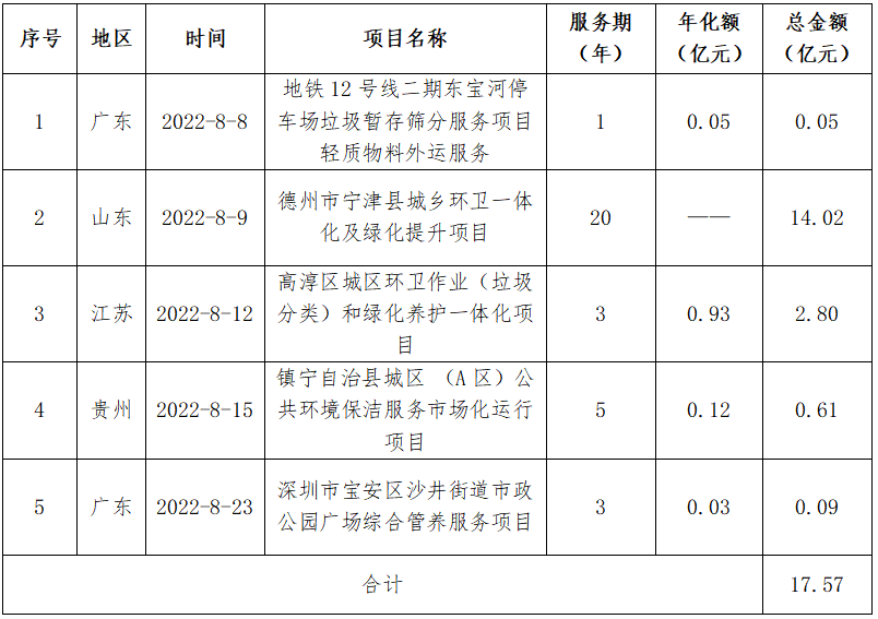表2 北控城市環(huán)境8月中標項目匯總
