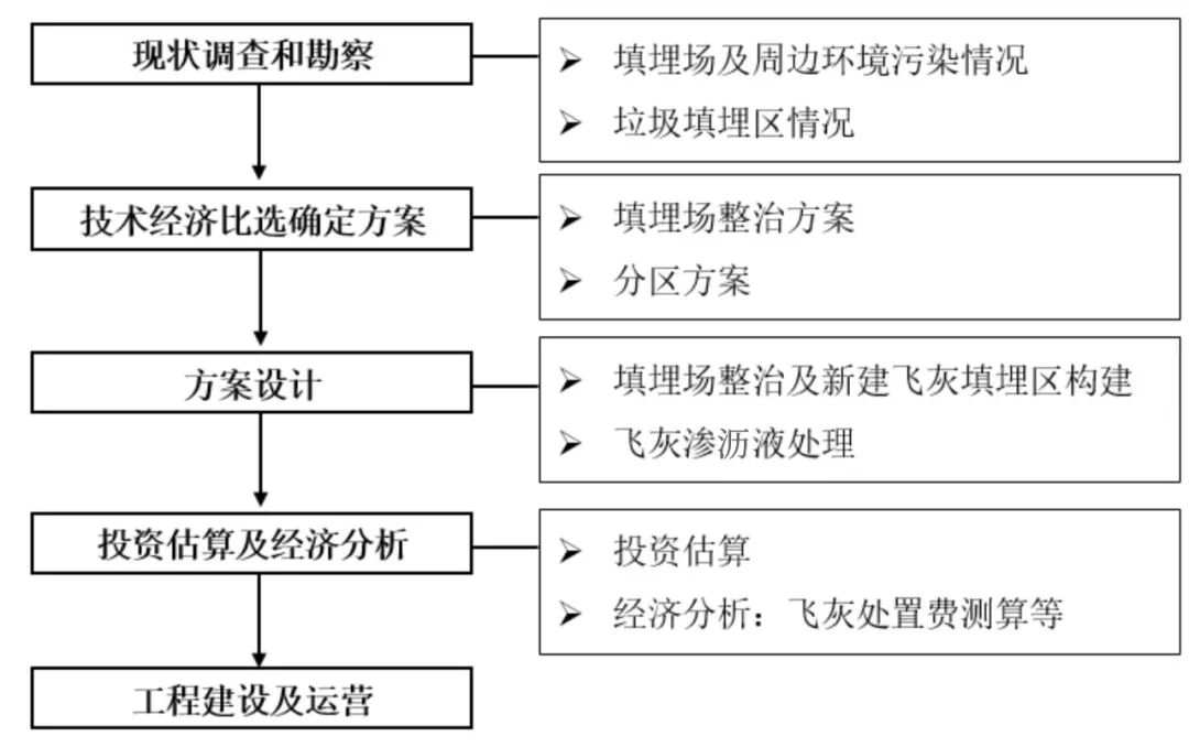 根據(jù)住房城鄉(xiāng)建設(shè)部發(fā)布的《2022年中國(guó)城市建設(shè)狀況公報(bào)》,截至2022年底,全國(guó)城市生活垃圾焚燒處理能力已達(dá) 80.46萬(wàn)噸/日,占比為72.53%。我國(guó)生活垃圾焚燒爐型主要為機(jī)械爐排爐和循環(huán)流化床,其中機(jī)械爐排爐飛灰產(chǎn)率一般為2%~5%,循環(huán)流化床飛灰產(chǎn)率一般為8%~15%。飛灰產(chǎn)率按3%~5%計(jì)算,則年產(chǎn)飛灰量約為881萬(wàn)~1468萬(wàn)噸。由于含有較高浸出濃度的重金屬和高毒性當(dāng)量的二噁英等有毒有害物質(zhì),生活垃圾焚燒飛灰被列入《國(guó)家危險(xiǎn)廢物名錄》。根據(jù)《2022年生態(tài)環(huán)境公報(bào)》,2022年工業(yè)危險(xiǎn)廢物產(chǎn)生量為9514.8萬(wàn)噸,飛灰占比約為9.2%~15.4%,飛灰產(chǎn)量較大。飛灰的妥善處置關(guān)系到生活垃圾焚燒廠的穩(wěn)定運(yùn)行,也是生活垃圾焚燒行業(yè)的難題和短板。目前,飛灰處置方式包括進(jìn)入危險(xiǎn)廢物填埋場(chǎng)填埋處置、固化/穩(wěn)定化處理后進(jìn)入生活垃圾填埋場(chǎng)填埋處置、水洗預(yù)處理后水泥窯協(xié)同處置、高溫熔融/玻璃化、高溫?zé)Y(jié)等,其中,固化/穩(wěn)定化處理后進(jìn)入生活垃圾填埋場(chǎng)填埋處置由于技術(shù)成熟且成本較低,是當(dāng)前飛灰處置的主流技術(shù)。填埋場(chǎng)分區(qū)改造建設(shè)必要性對(duì)于新建填埋場(chǎng)選址困難或飛灰產(chǎn)量較小的地區(qū),對(duì)現(xiàn)有生活垃圾填埋場(chǎng)進(jìn)行分區(qū)改造以滿足固化/穩(wěn)定化飛灰填埋要求是較為經(jīng)濟(jì)可行的方式。隨著生活垃圾焚燒發(fā)電廠的建成,現(xiàn)有生活垃圾填埋場(chǎng)將停止接收生活垃圾,若現(xiàn)有生活垃圾填埋場(chǎng)尚有可利用的剩余庫(kù)容,對(duì)其進(jìn)行分區(qū)改造,既可以充分發(fā)揮其稀缺資源作用,又可以解決生活垃圾焚燒廠的飛灰處置和大修期內(nèi)生活垃圾應(yīng)急處置問(wèn)題,同時(shí)還可以完善生活垃圾填埋場(chǎng)的現(xiàn)有設(shè)施并治理現(xiàn)存污染,可謂一舉多得。因此,分區(qū)改造項(xiàng)目的建設(shè)十分必要且具有意義。總的來(lái)說(shuō),項(xiàng)目的建設(shè)具有較好的經(jīng)濟(jì)、環(huán)保和社會(huì)效益,具體體現(xiàn)在:經(jīng)濟(jì)效益:固化/穩(wěn)定化飛灰填埋收益可部分覆蓋現(xiàn)有生活垃圾填埋場(chǎng)治理投資;環(huán)保效益:現(xiàn)有生活垃圾填埋場(chǎng)污染問(wèn)題得到改善、飛灰得到妥善處置;社會(huì)效益:填埋場(chǎng)原址改造,避免了新選址帶來(lái)的占用土地資源、搬遷、新的環(huán)境影響源等問(wèn)題。如前所述,生活垃圾填埋場(chǎng)分區(qū)改造具有填埋場(chǎng)治理及飛灰入場(chǎng)填埋的雙重屬性,因此,其建設(shè)流程可以參考生活垃圾衛(wèi)生填埋場(chǎng)封場(chǎng)治理、擴(kuò)建,并結(jié)合項(xiàng)目的實(shí)際情況及當(dāng)?shù)叵嚓P(guān)主管部門(mén)的要求進(jìn)行,從建設(shè)方案角度,推薦建設(shè)流程如下圖所示: