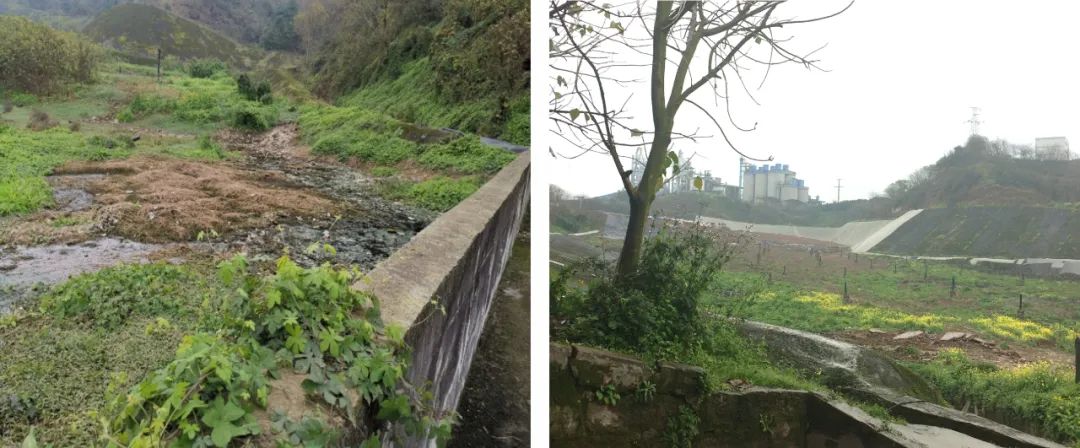 ▲圖1 生活垃圾填埋場(chǎng)分區(qū)改造建設(shè)流程上述流程中,需要說(shuō)明的有以下幾點(diǎn):現(xiàn)狀調(diào)查和勘察是首要步驟。現(xiàn)狀調(diào)查和勘察可以厘清填埋場(chǎng)現(xiàn)狀污染和現(xiàn)狀設(shè)施情況,同時(shí)為堆體的穩(wěn)定安全性及改造方案提供依據(jù)。根據(jù)現(xiàn)有垃圾填埋情況,填埋場(chǎng)整治方案分為原位治理和異地處置兩種,異地處置一般適用于已填垃圾量較少的情況,對(duì)于垃圾填埋量較大的填埋場(chǎng),通常選用原位治理方案。分區(qū)方案大致可以分為水平分區(qū)和垂直分區(qū)兩種,顧名思義,水平分區(qū)就是固化/穩(wěn)定化飛灰填埋區(qū)和生活垃圾填埋區(qū)為水平方向上的兩個(gè)獨(dú)立庫(kù)區(qū),垂直分區(qū)就是在現(xiàn)有生活垃圾堆體之上構(gòu)建獨(dú)立的固化/穩(wěn)定化飛灰填埋區(qū)。水平分區(qū)適用于原生活垃圾填埋場(chǎng)有未填埋垃圾的區(qū)域或填埋深度較淺通過(guò)垃圾清理可以獲得水平向的獨(dú)立庫(kù)區(qū),對(duì)于垃圾填埋量較大、填埋深度較深的填埋場(chǎng),采用垂直分區(qū)方案更經(jīng)濟(jì)可行。水平分區(qū)方案建設(shè)內(nèi)容主要包括新建分區(qū)壩、構(gòu)建飛灰獨(dú)立庫(kù)區(qū)的雙層防滲系統(tǒng)、飛灰滲瀝液導(dǎo)排及處理系統(tǒng);垂直分區(qū)方案則更為復(fù)雜,在現(xiàn)有生活垃圾堆體之上構(gòu)建垂直的飛灰獨(dú)立庫(kù)區(qū),還需要考慮現(xiàn)有生活垃圾堆體沉降、填埋氣導(dǎo)排堵塞、生活垃圾堆體液位高等影響飛灰堆體穩(wěn)定安全的一系列問(wèn)題,并給出解決方案。飛灰滲瀝液的水質(zhì)特點(diǎn)與生活垃圾滲瀝液完全不同,這與飛灰的形成和螯合固化工藝有關(guān),具體表現(xiàn)為:1)Cl-含量極高;2)Ca2+ 含量較高;3)鉛等重金屬含量偏高;4)COD和NH3-N等指標(biāo)偏低,若煙氣處理或飛灰螯合固化過(guò)程中采用滲瀝液處理的濃縮液,則會(huì)導(dǎo)致COD和NH3-N升高。以上特點(diǎn)導(dǎo)致常見(jiàn)的生化技術(shù)和膜分離技術(shù)都無(wú)法正常運(yùn)行,而采用簡(jiǎn)單的氧化還原處理工藝則難以達(dá)到排放標(biāo)準(zhǔn),故目前飛灰滲瀝液的處理思路通常為:采用晴天作業(yè)雨天不作業(yè)、加強(qiáng)雨污分流覆蓋等方式將飛灰滲瀝液產(chǎn)量控制到最低,若產(chǎn)生少量的飛灰滲瀝液,則輸送至就近的生活垃圾滲瀝液處理站協(xié)同處理。工程建設(shè)和運(yùn)營(yíng)建議。1)工程施工:建議避開(kāi)雨季,若在雨季施工,盡量減少垃圾裸露面積,以控制臭氣和滲瀝液量;為避免施工裸露或施工碾壓將生活垃圾堆體積存的滲瀝液排出等施工期間滲瀝液大增的情況,建議提前做好預(yù)案。2)運(yùn)營(yíng)管理:建議做好雨污分流,控制飛灰滲瀝液的產(chǎn)量;若采用垂直分區(qū),建議按規(guī)范要求重點(diǎn)監(jiān)測(cè)垃圾堆體沉降、位移等填埋場(chǎng)安全運(yùn)行的相關(guān)指標(biāo)。西南地區(qū)某山谷型生活垃圾填埋場(chǎng),設(shè)計(jì)庫(kù)容約244萬(wàn)m3,改造時(shí)已填埋生活垃圾約130多萬(wàn)m3,剩余庫(kù)容約110萬(wàn)m3,垃圾填埋深度在20m左右。通過(guò)現(xiàn)狀調(diào)查發(fā)現(xiàn)該填埋場(chǎng)填埋了大量市政污泥、滲瀝液導(dǎo)排系統(tǒng)已堵塞、填埋氣導(dǎo)排系統(tǒng)效果不好、垃圾堆體中滲瀝液液位高、壩前形成了污泥坑,因此,給項(xiàng)目的實(shí)施帶來(lái)了嚴(yán)峻的挑戰(zhàn)。改造前現(xiàn)場(chǎng)情況見(jiàn)圖2。