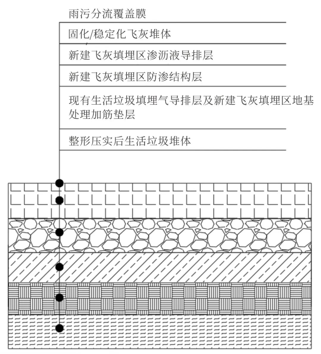 ▲圖2 生活垃圾填埋場(chǎng)改造前現(xiàn)場(chǎng)情況根據(jù)《生活垃圾填埋場(chǎng)污染控制標(biāo)準(zhǔn)》(GB 16889-2008)等相關(guān)標(biāo)準(zhǔn)要求,經(jīng)處理合格滿足入場(chǎng)條件的生活垃圾焚燒飛灰在生活垃圾填埋場(chǎng)中應(yīng)單獨(dú)分區(qū)填埋。固化/穩(wěn)定化飛灰當(dāng)長(zhǎng)期在生活垃圾產(chǎn)生的酸性滲瀝液浸泡下具有滲出有害物質(zhì)的潛在風(fēng)險(xiǎn),故要求分區(qū)填埋。通過(guò)方案比選,異地處置和水平分區(qū)由于需要大規(guī)模的開(kāi)挖、臭氣等環(huán)境影響更大、工程建設(shè)周期長(zhǎng)、投資較高等較難實(shí)施,故本項(xiàng)目確定采用原位治理的垂直分區(qū)方案。固化/穩(wěn)定化飛灰與生活垃圾性質(zhì)完全不同,其密度大于生活垃圾,此外,生活垃圾堆體通常會(huì)隨著時(shí)間的推移發(fā)生沉降,并繼續(xù)產(chǎn)生填埋氣和滲瀝液,因此,如何確保固化/穩(wěn)定化飛灰入場(chǎng)填埋后填埋場(chǎng)的穩(wěn)定安全,是本項(xiàng)目擬解決的關(guān)鍵問(wèn)題。