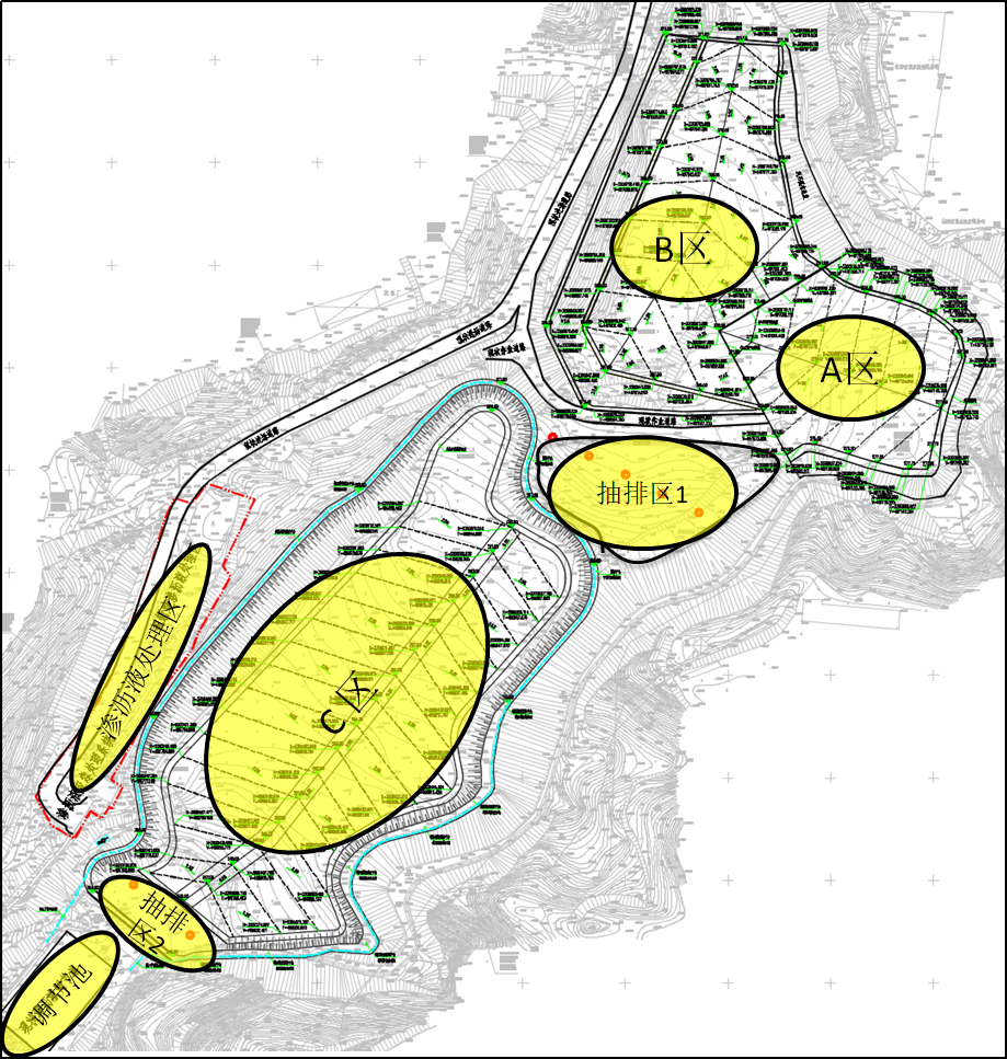 根據(jù)項(xiàng)目的實(shí)際情況,本項(xiàng)目采用分區(qū)建設(shè)、分區(qū)運(yùn)行的方案,分區(qū)方案詳見(jiàn)圖4。本項(xiàng)目由庫(kù)區(qū)中部的進(jìn)場(chǎng)道路分隔成兩個(gè)大的區(qū)域,遠(yuǎn)離調(diào)節(jié)池的為上游填埋區(qū)、靠近調(diào)節(jié)池的為下游填埋區(qū),其中,上游填埋區(qū)根據(jù)生活垃圾填埋情況、垃圾堆體液位及承載力情況,分為A、B區(qū)。本項(xiàng)目首先實(shí)施條件最好的A區(qū),再依次實(shí)施B、C區(qū)。在庫(kù)區(qū)中部和壩前設(shè)置了兩個(gè)抽排區(qū),通過(guò)新增降水井對(duì)生活垃圾滲瀝液進(jìn)行抽排,以控制和觀測(cè)垃圾堆體液位,保障填埋場(chǎng)的安全運(yùn)行。