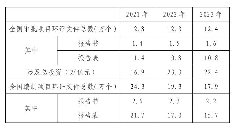 2023年全國共審批項目環(huán)評文件12.4萬個,同前兩年基本持平。近三年全國審批及編制環(huán)評文件數(shù)量情況見表1。