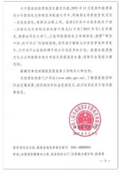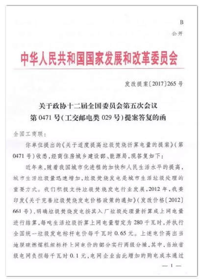 今年年初,環(huán)境商會(huì)以全國工商聯(lián)團(tuán)體提案的形式向兩會(huì)遞交《關(guān)于適度提高垃圾焚燒折算電量的提案》,國家發(fā)改委于9月正式答復(fù)。
